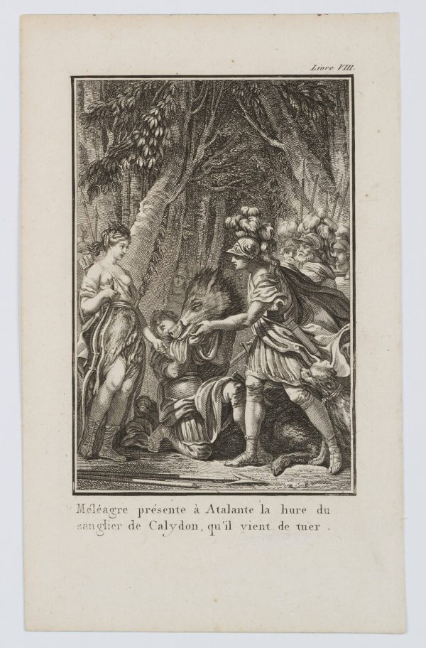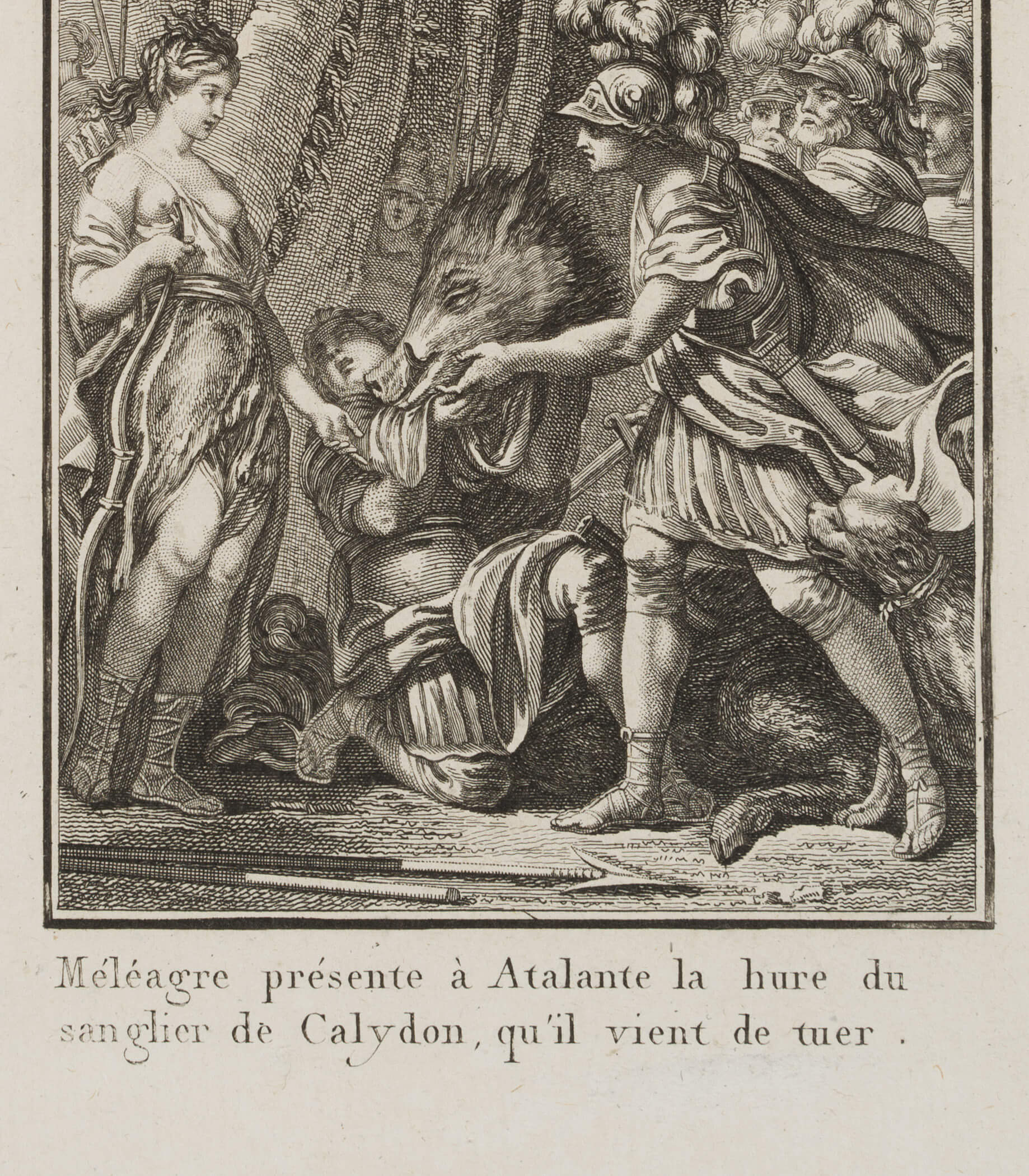 - Description: Unter der Darstellung beschriftet mit: “Mlagre prsente Atalante la hure du sanglier de Calydon, qu’il vient de tuer”.