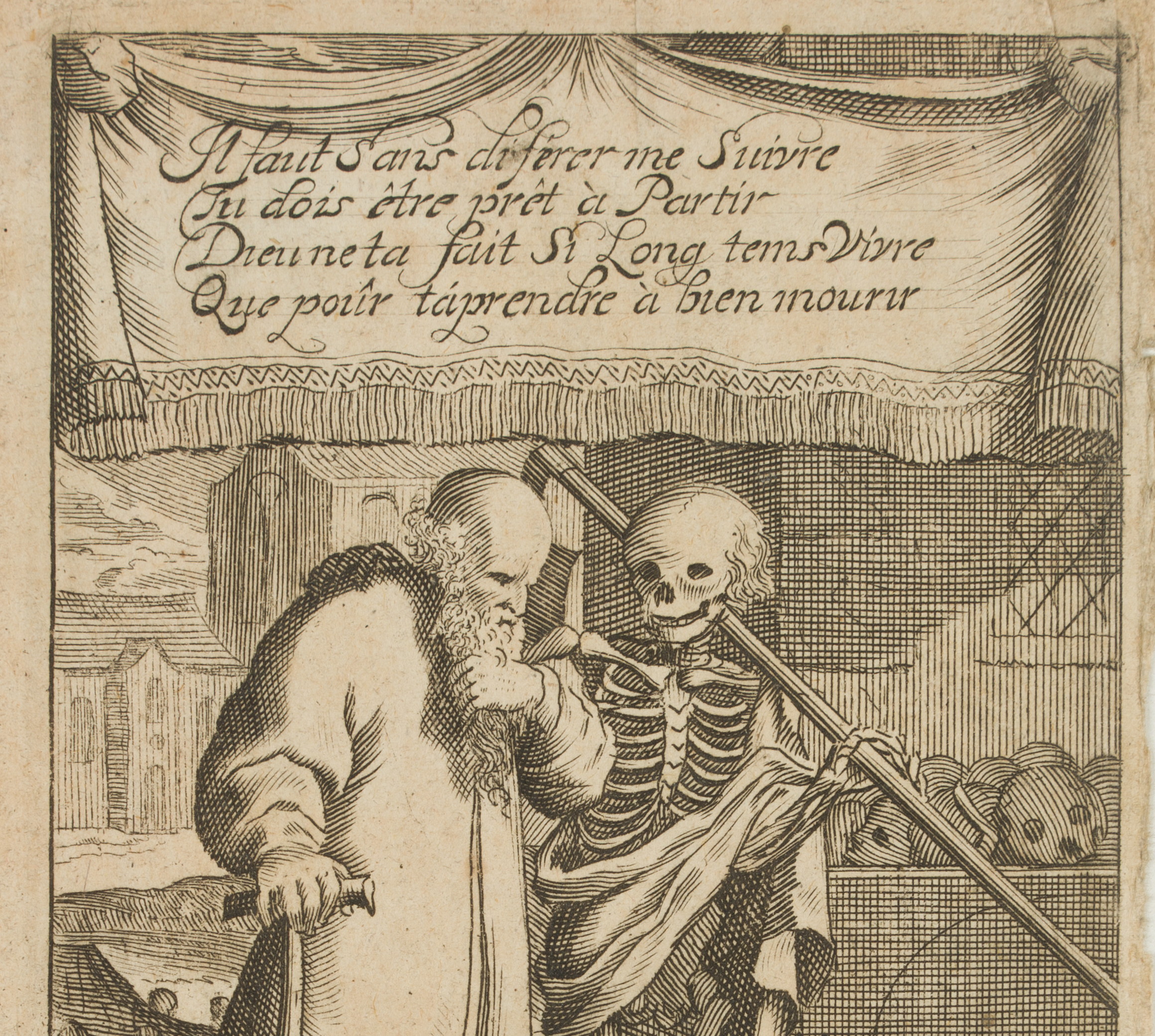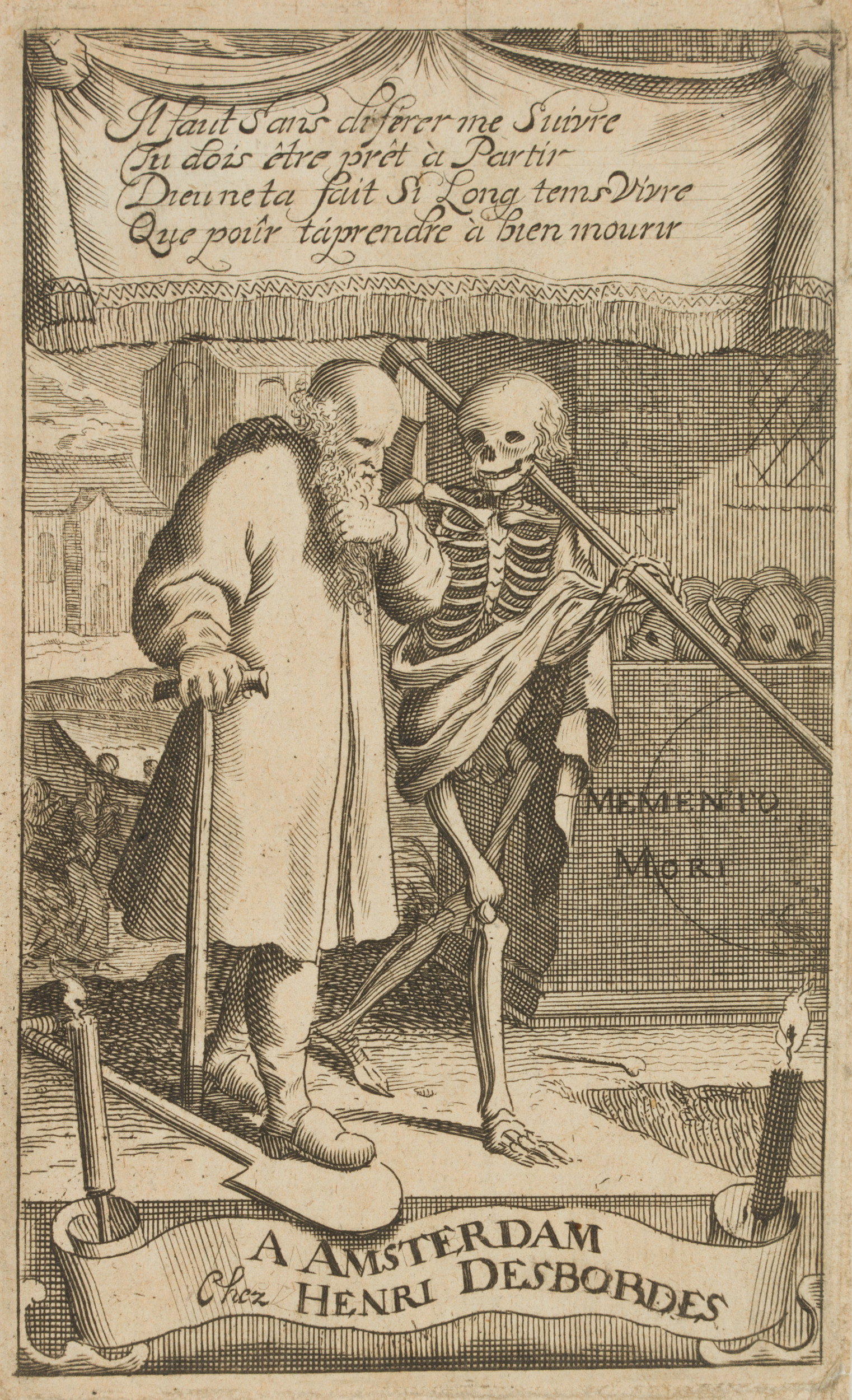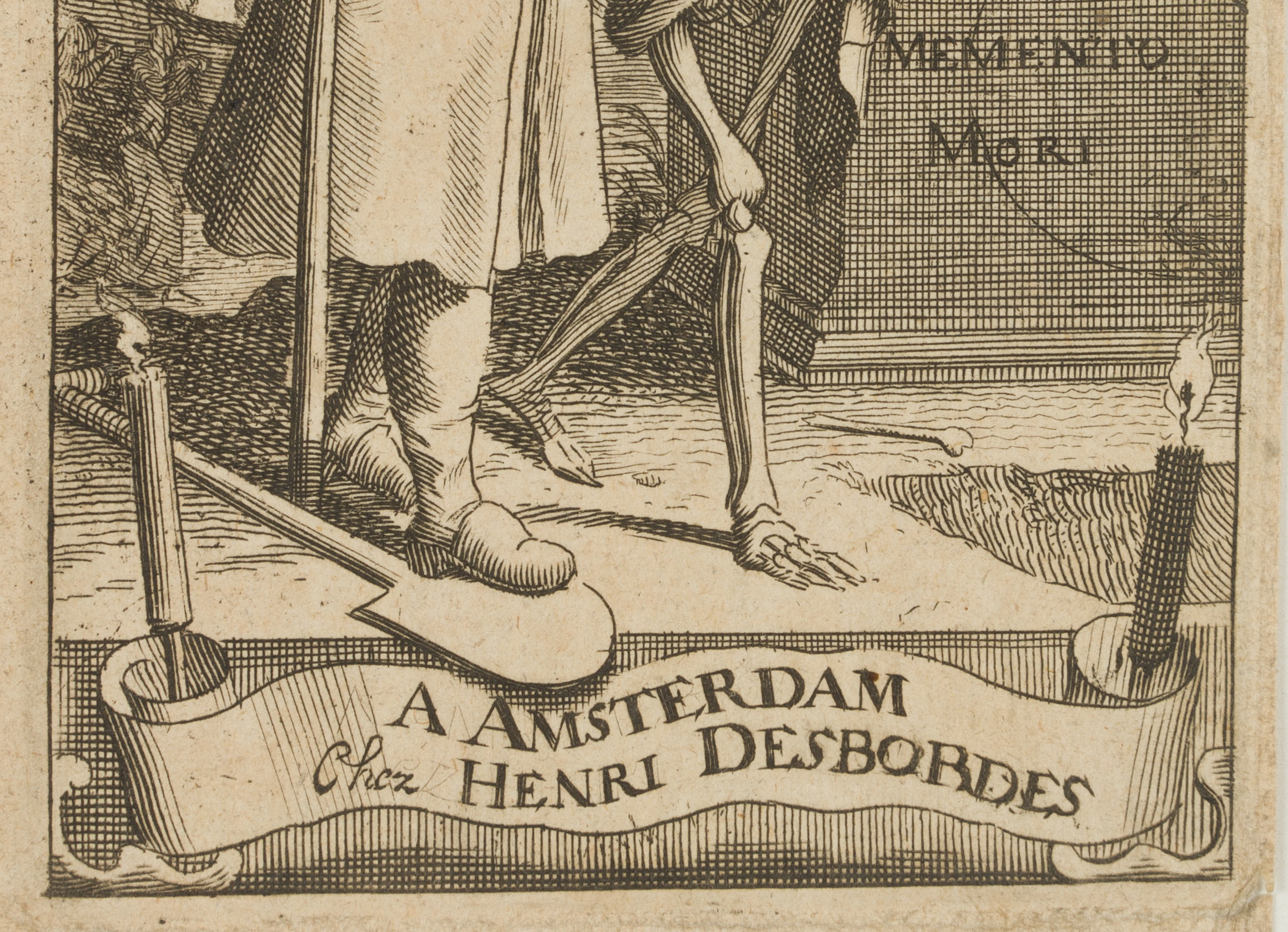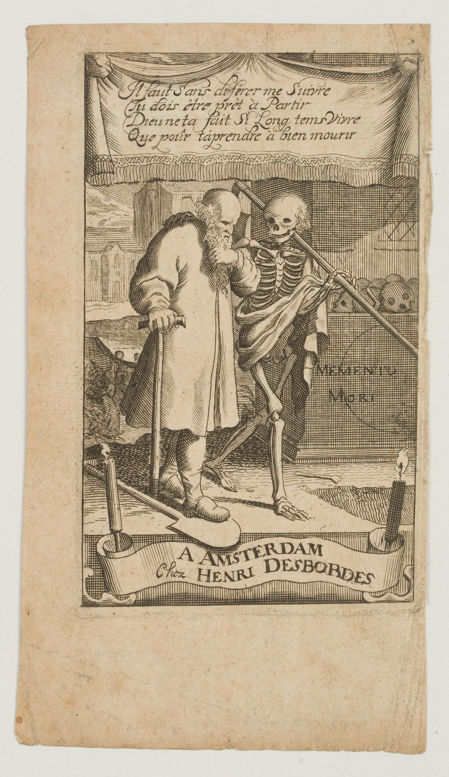 - Inscription: Inscribed in the printing plate: “Il faut sains diférer me Suivre […] / Memento Mori / A Amsterdam chez Henri Desbordes”. Verso further inscription: “Consolations de l’âme fidele, chs […] 1699 […]”.