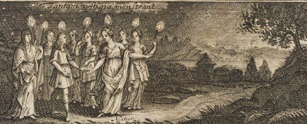 - Description: Title vignette with nocturnal procession, inscribed “Tantum vestigia monstrant[?]”, signed below the image on the right.