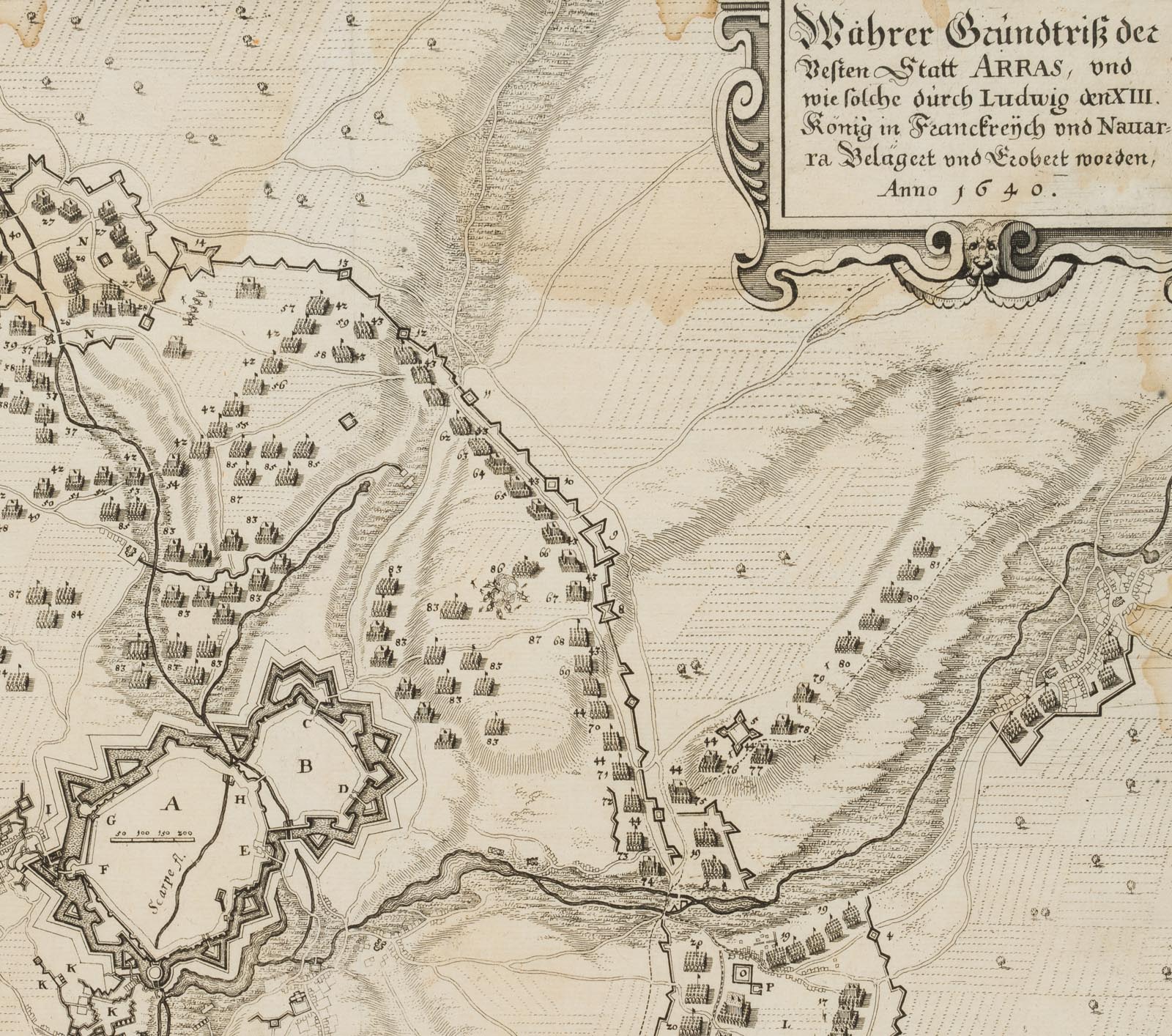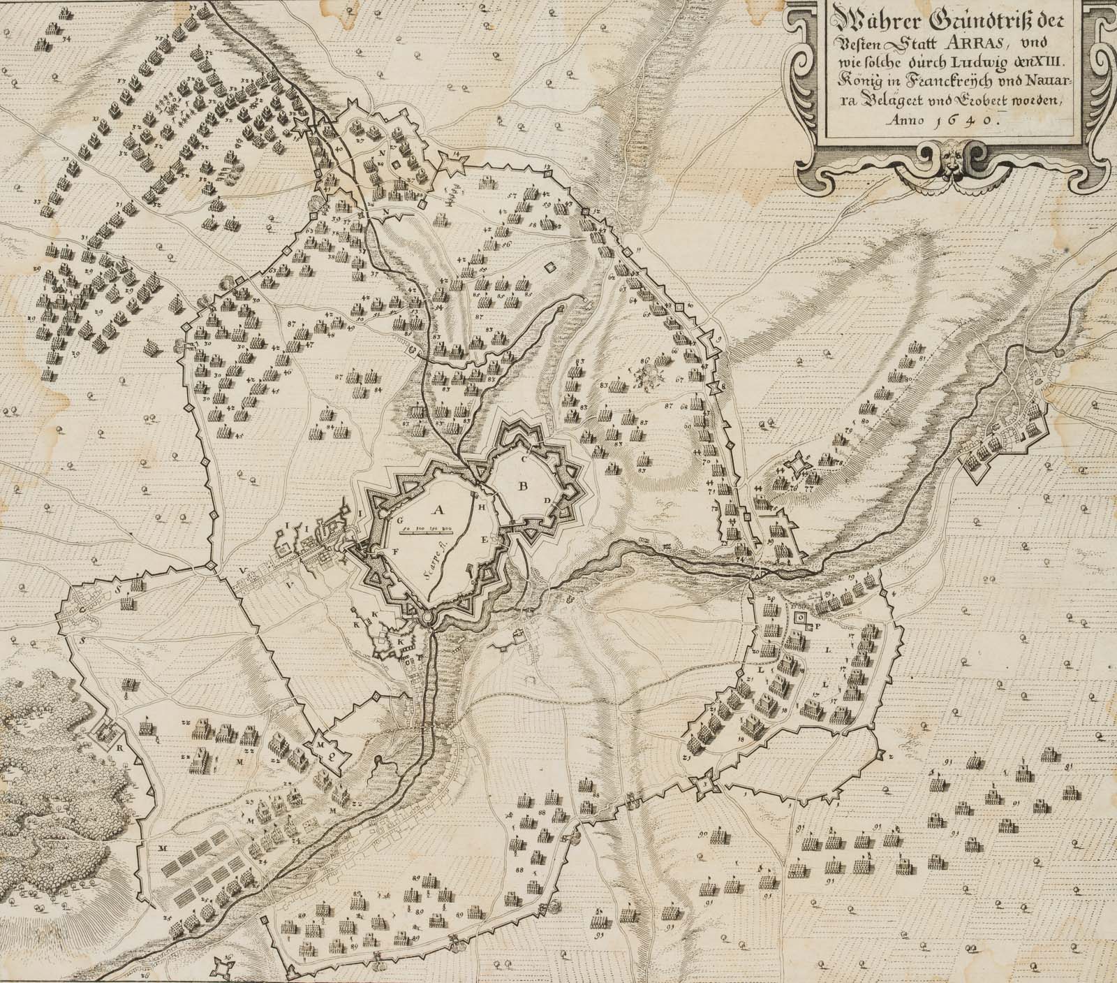 • Bezeichnung: Rechts oben in der Kartusche beschriftet mit: “Wahrer Grundriß der festen Statt Arras, und wie solche durch Ludwig den XIII König in Frankreich und Nauarra belagert und erobert worden, Anno 1640”.