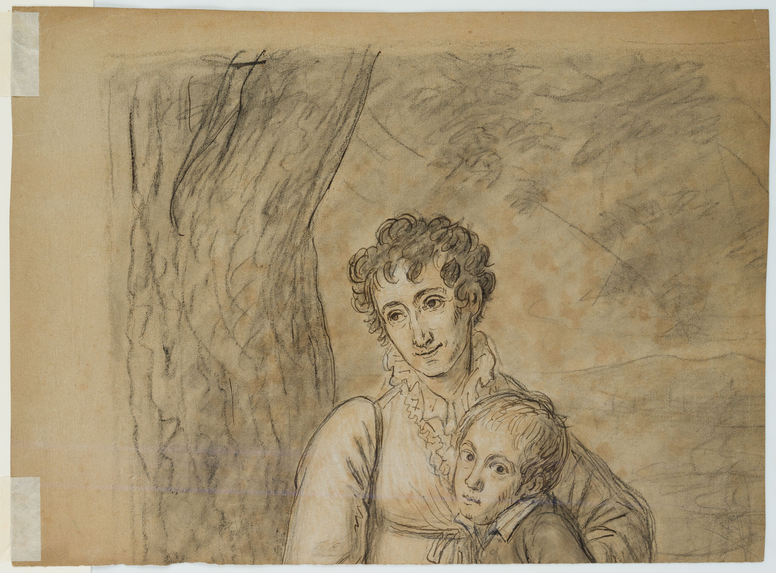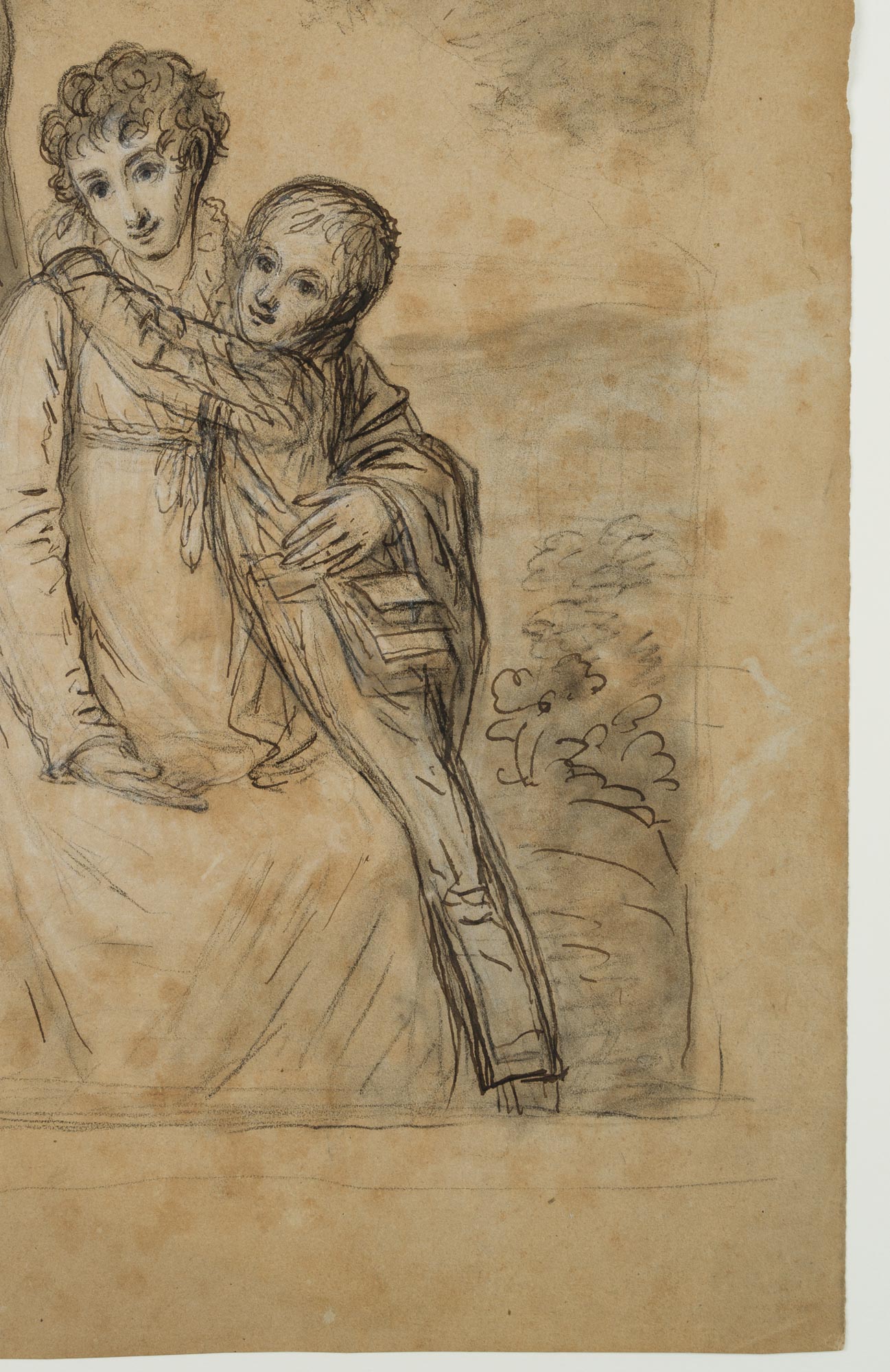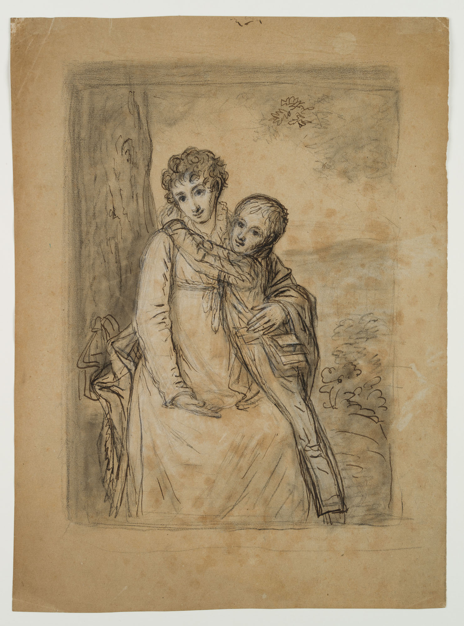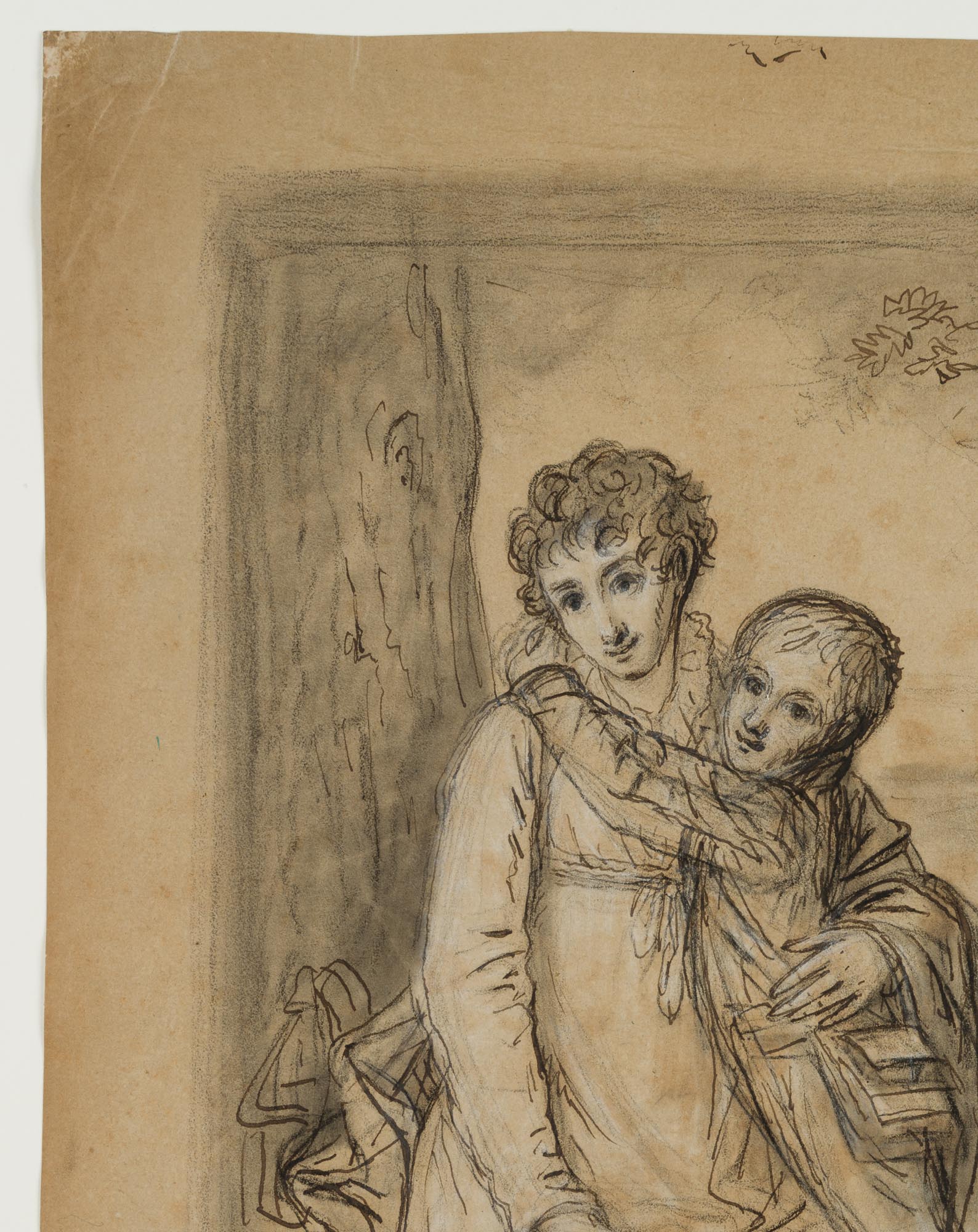 Verso beschnittene größere Version der Darstellung. Eine äußerst entzückende und liebevolle Szene nimmt der Künstler hier in den Blick: Eine Mutter umarmt mit der linken ihren vielleicht achtjährigen Sohn, der wiederum die Arme um ihren Hals schlingt. Die verschiedenen Ansätze und suchenden Linien in der Zeichnung, die wir bei der Positionierung des Armes des Jungen entdecken, und auch die beschnittene Zeichnung auf der Rückseite, die eine größere Version der Darstellung zeigt, weisen die Zeichnung als vorbereitendes Werk aus, etwa für ein Gemälde. Sowohl Kleidung der Dargestellten als auch die Klarheit und Ruhe, die der Komposition entströmt, können als typisch für die Zeit des Klassizismus gelten.
