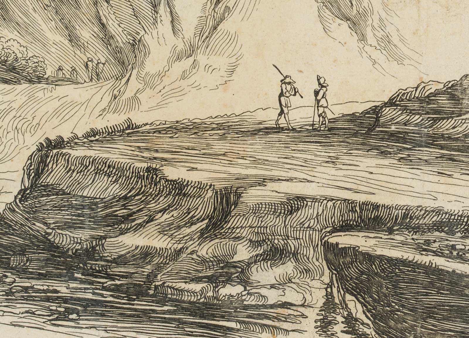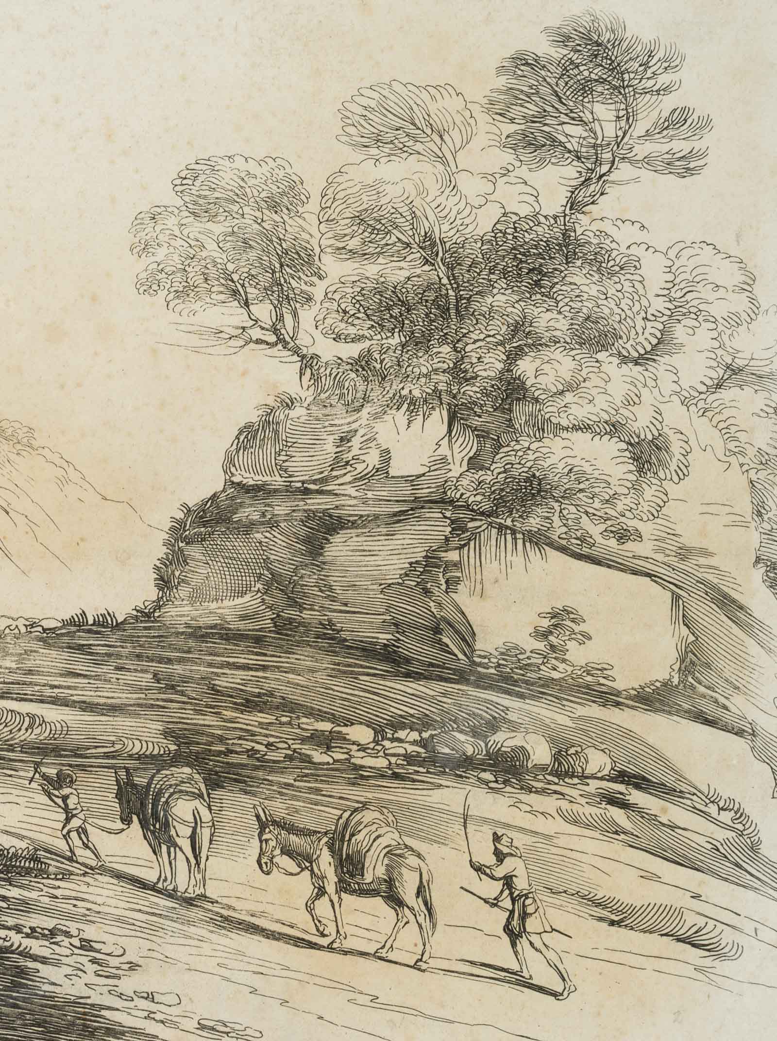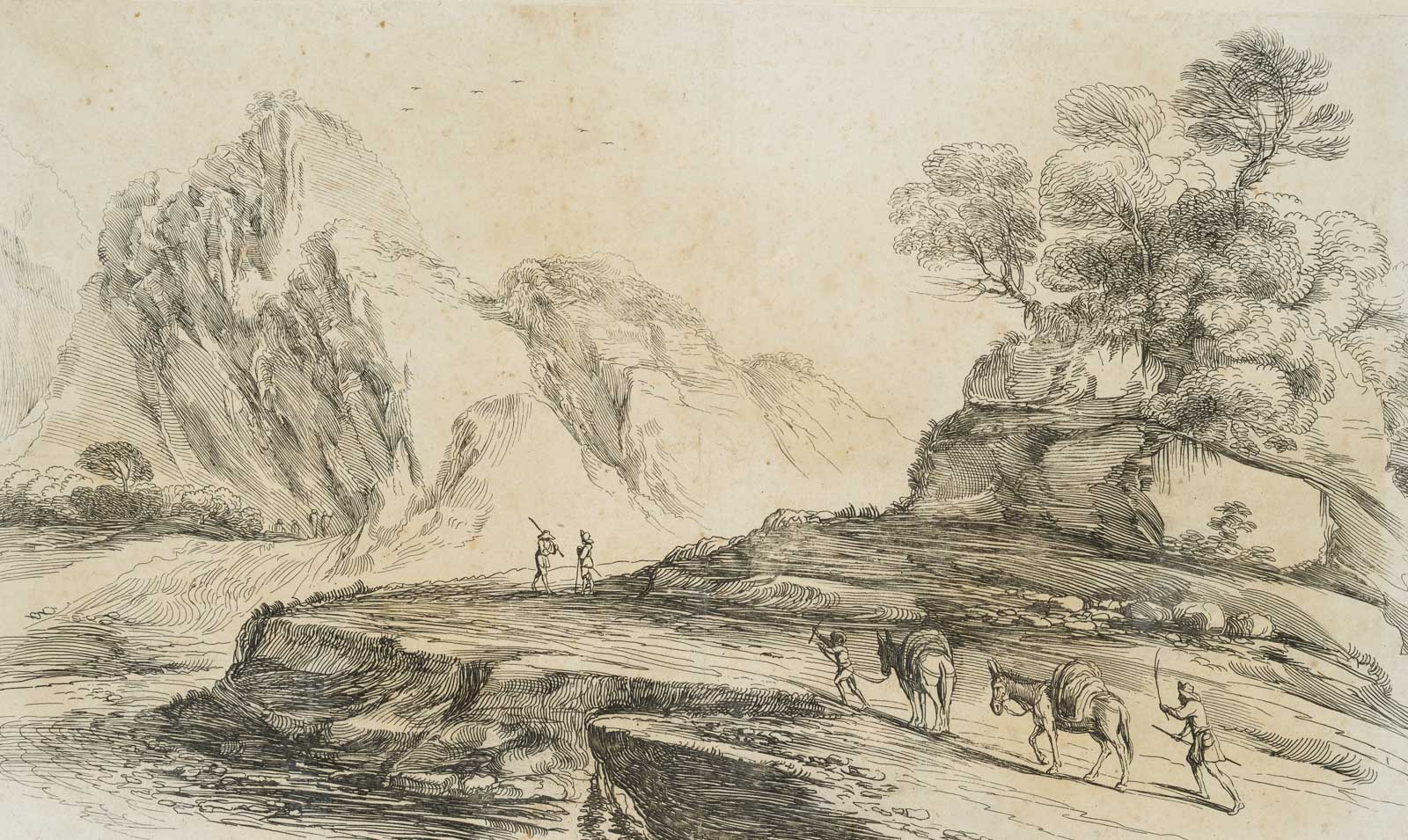 - Description: View of a rugged landscape with two shepherds with mules in the foreground, then two more figures in the middle ground. They give a view of a valley, behind which a mountain range adjoins in the background. The depiction was probably created after a work by the Italian Baroque painter GUERCINO, from whom numerous drawings have survived.