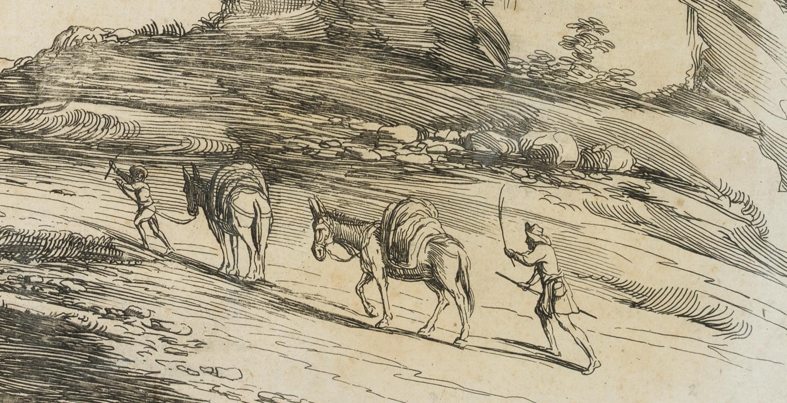 - Beschreibung: Blick in eine raue Landschaft, in deren Vordergrund zwei Hirten mit Maultieren zu sehen sind, im Mittelgrund dann zwei weitere Figuren. Sie geben den Blick frei auf ein Tal, hinter dem sich im Hintergrund eine Bergkette anschließt. Die Darstellung entstand vermutlich nach einer Arbeit des italienischen Barockmalers GUERCINO, von dem zahlreiche Zeichnungen erhalten sind.