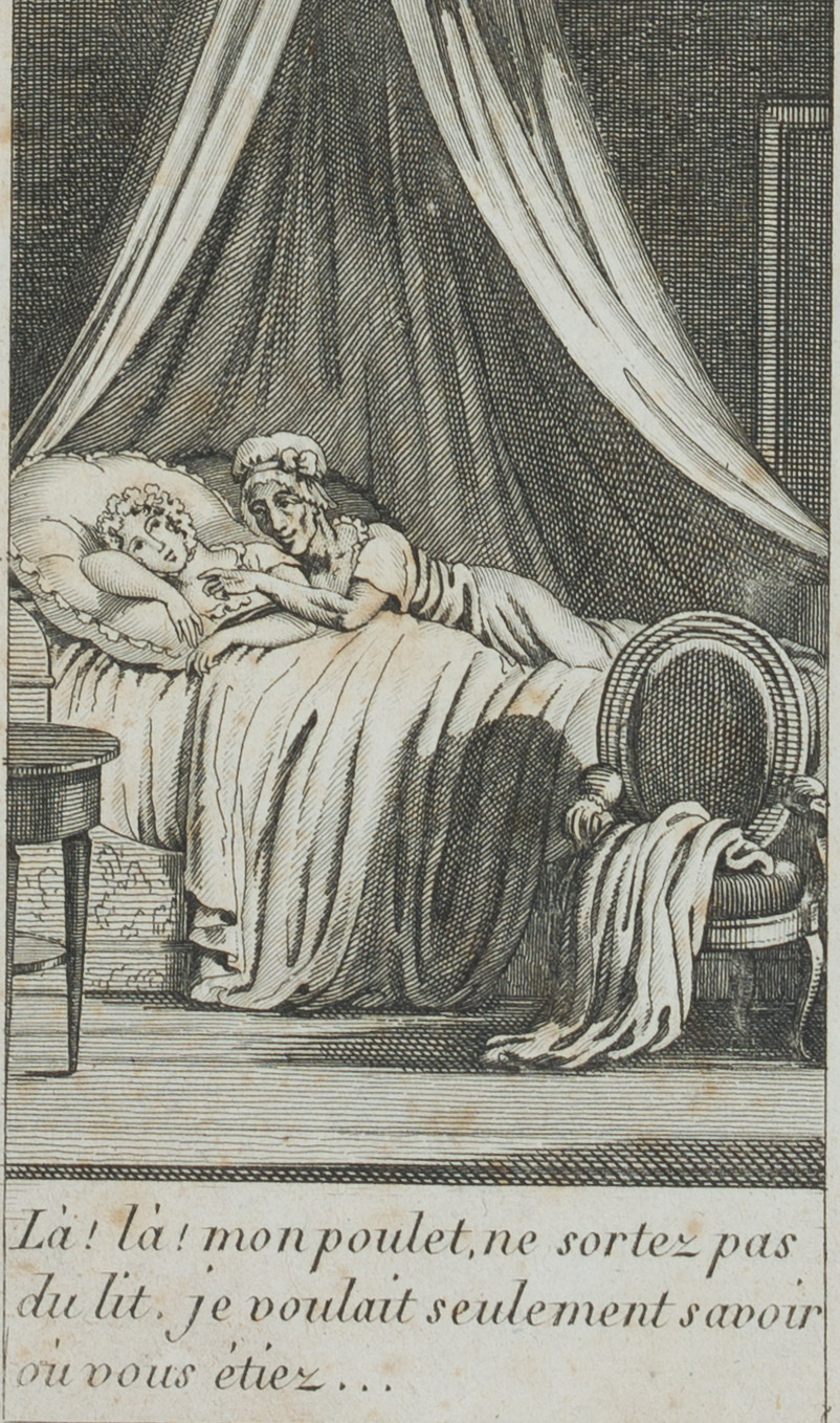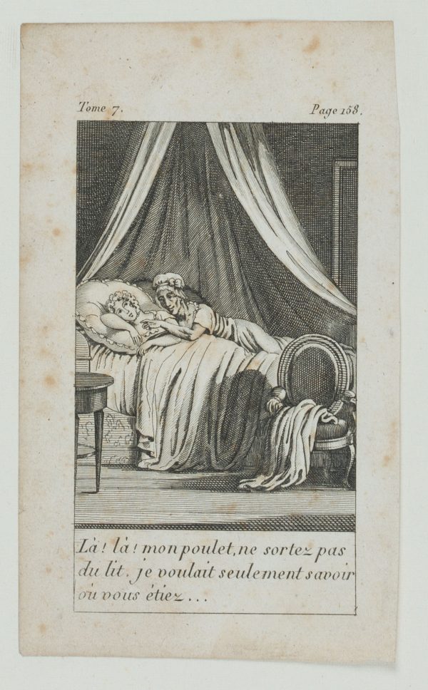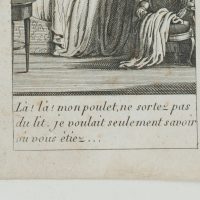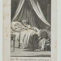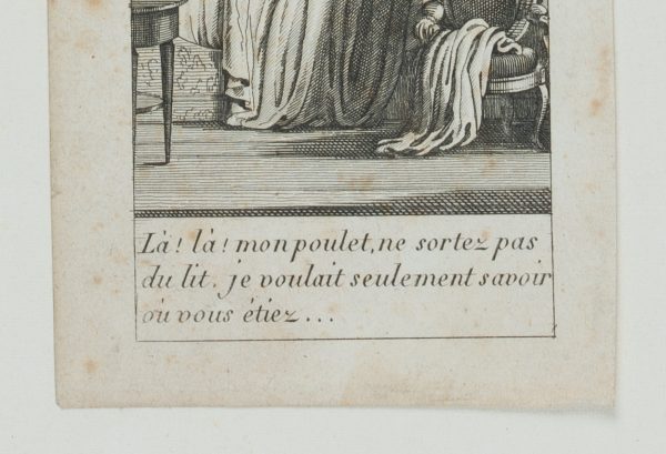 Unknown (18th century), Là! Là! Mon poulet, ne sortez pas du lit, je voulait seulement savoir où vous étiez …’ – Night raid. Young lady is confronted at the bedside, 18th century, Copper engraving