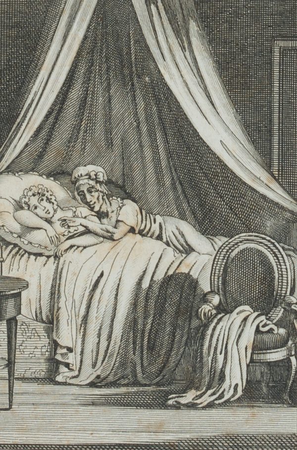 Unbekannt (18. Jahrhundert), Là! Là! Mon poulet, ne sortez pas du lit, je voulait seulement savoir où vous étiez …’ – Nächtlicher Überfall. Junge Dame wird am Bett zur Rede gestellt, 18. Jahrhundert, Kupferstich