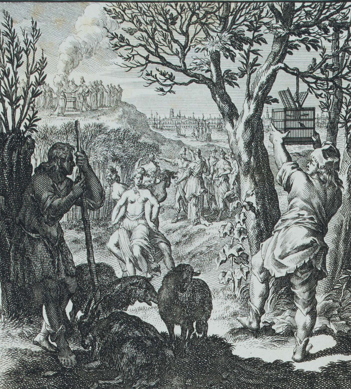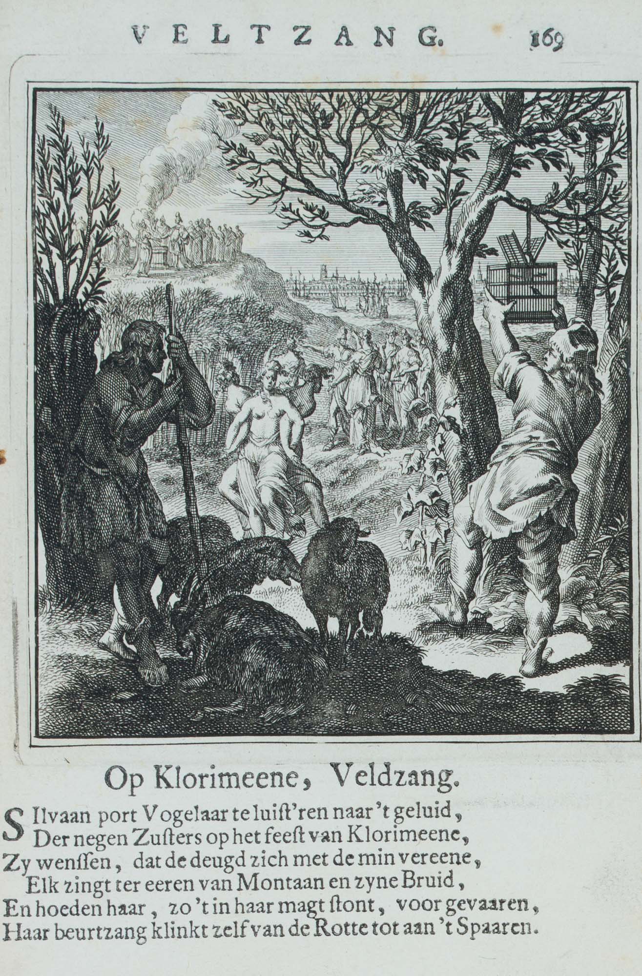 - Beschreibung: Literarische Illustrationen, aus Lukas Schermers Poëzy, herausgegeben 1725 in Amsterdam von Johannes Ratelband, Seite 169. Illustration aus ‘Veltzang’.