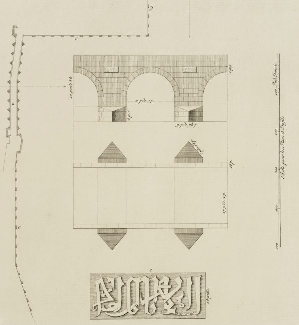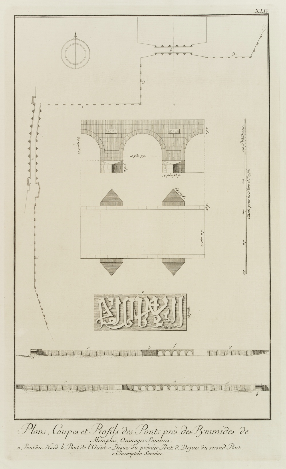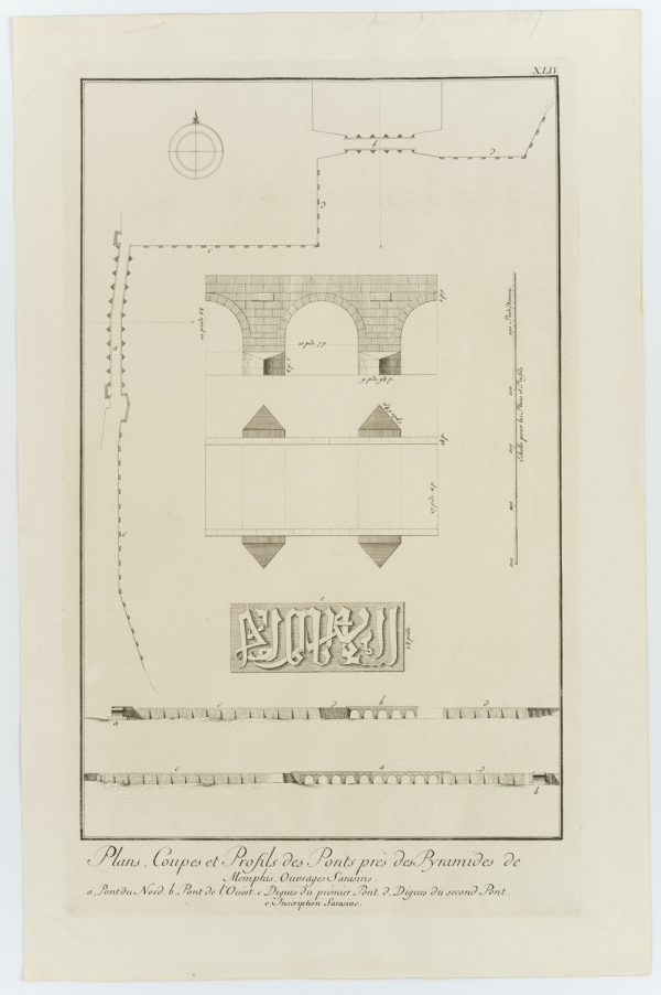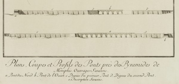 - Bezeichnung: Unterhalb in der Druckplatte bezeichnet: “Plans, Coupes et Profils des Ponts près des Pyramides de Memphis: ouvages Sarasins. a, Pont du Nord. b. Pont de l’Ouest. c. Digues du prémier Pont. d. Digues du second Pont. e. Inscription Sarasine.”