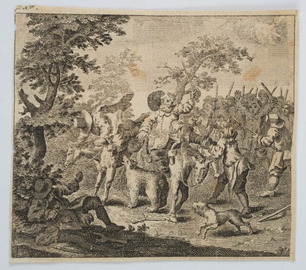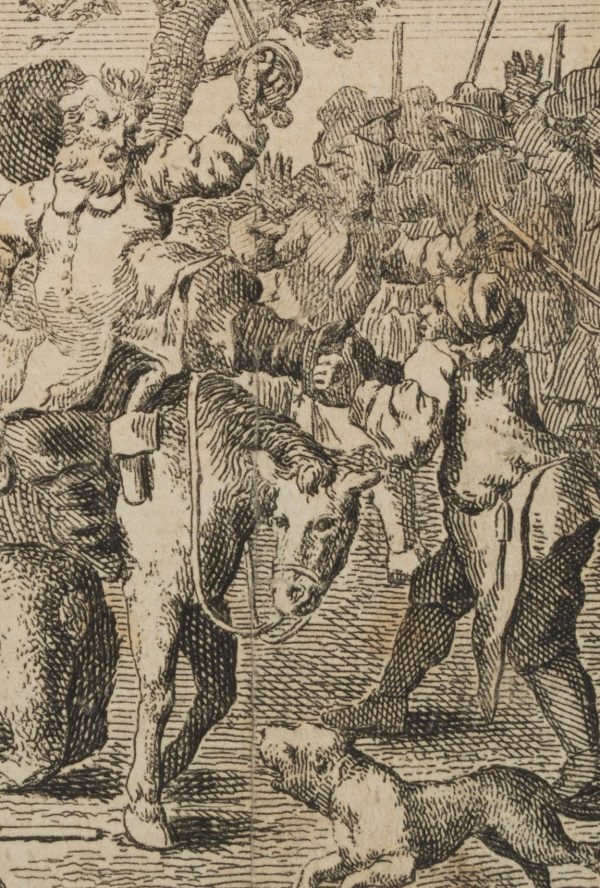 - Inscription: On the left in the foreground one of the travellers is still resting in the shade of a tree and startles at the moment of the attack. Verso with collector’s mark: Circle with “P”.