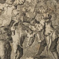- Bezeichnung: Links im Bildvordergrund liegt noch einer der Reisenden ruhend im Schatten eines Baumes und schreckt im Moment des Angriffs auf. Verso mit Sammelzeichen: Kreis mit “P”.