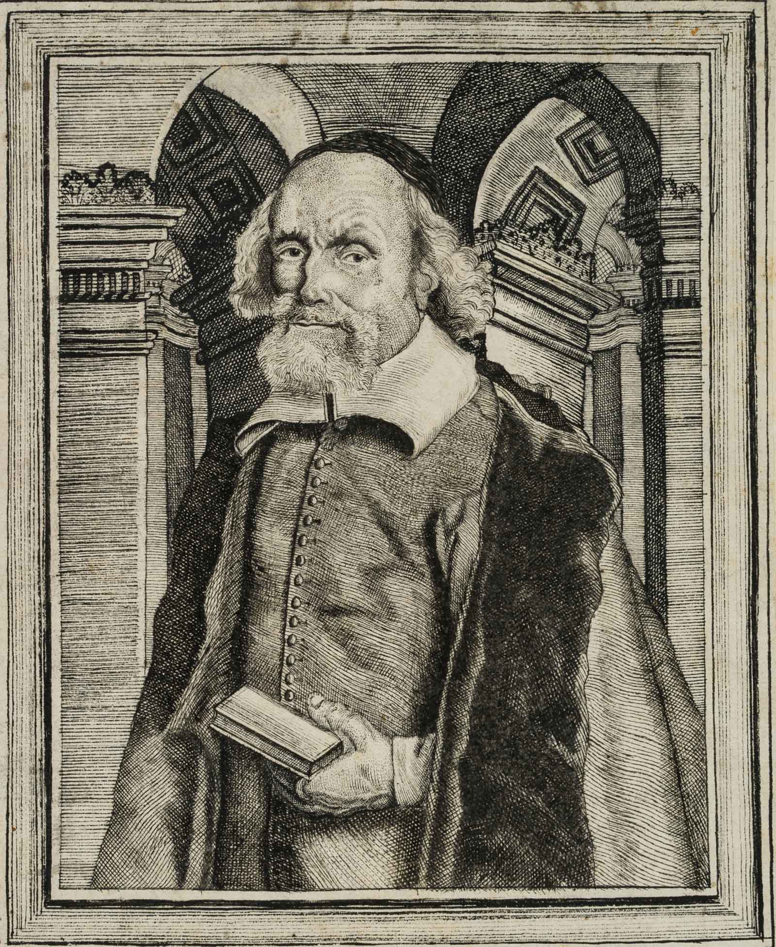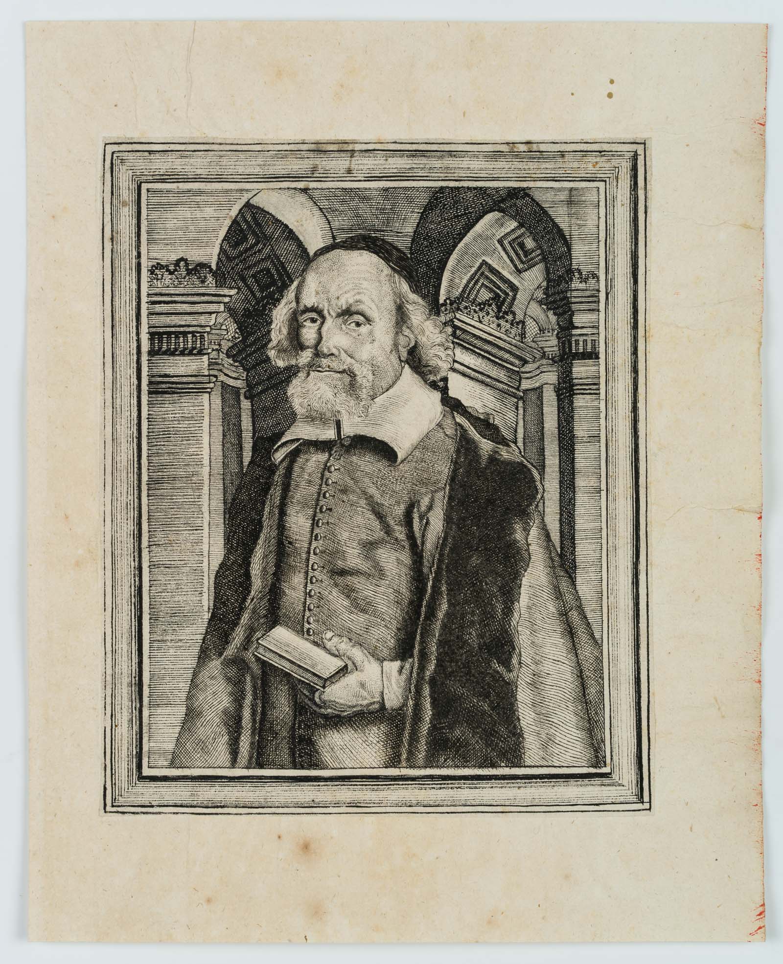 Unbekannt (18. Jahrhundert), Porträt als Halbfigur eines Gelehrten mit pelzverbrämten Mantel, einem Bart und Buch in der Hand, um 1750, Kupferstich