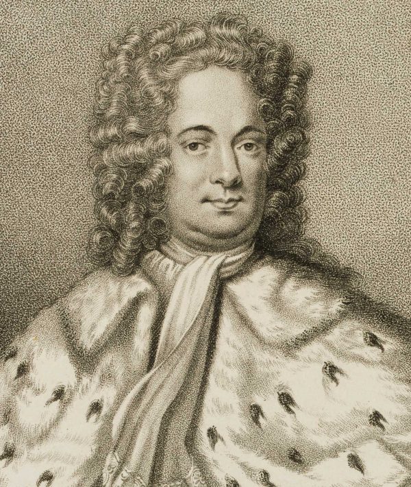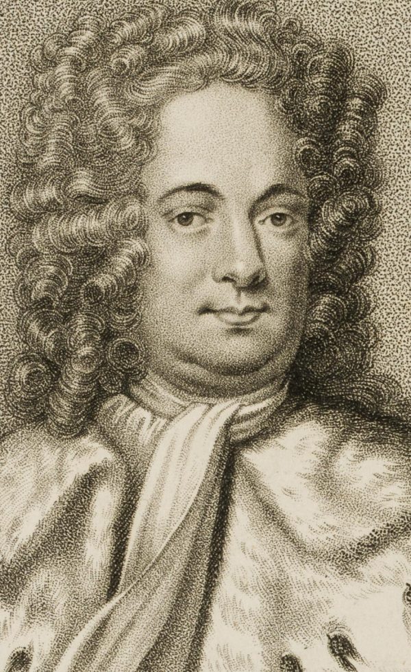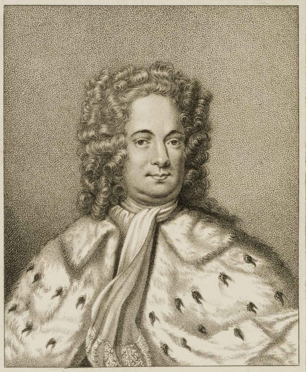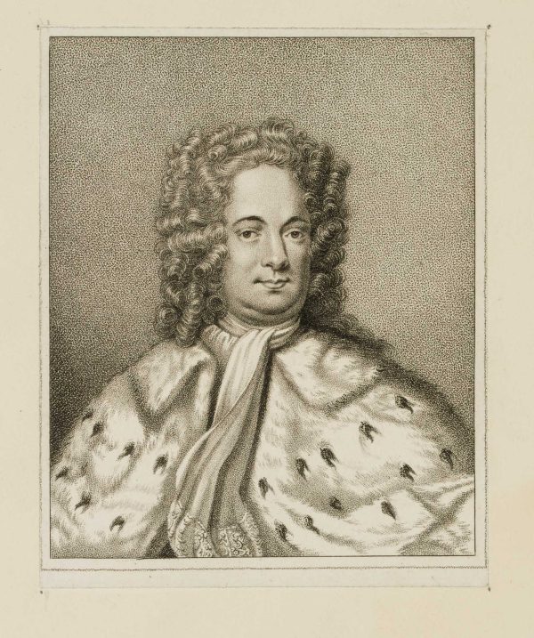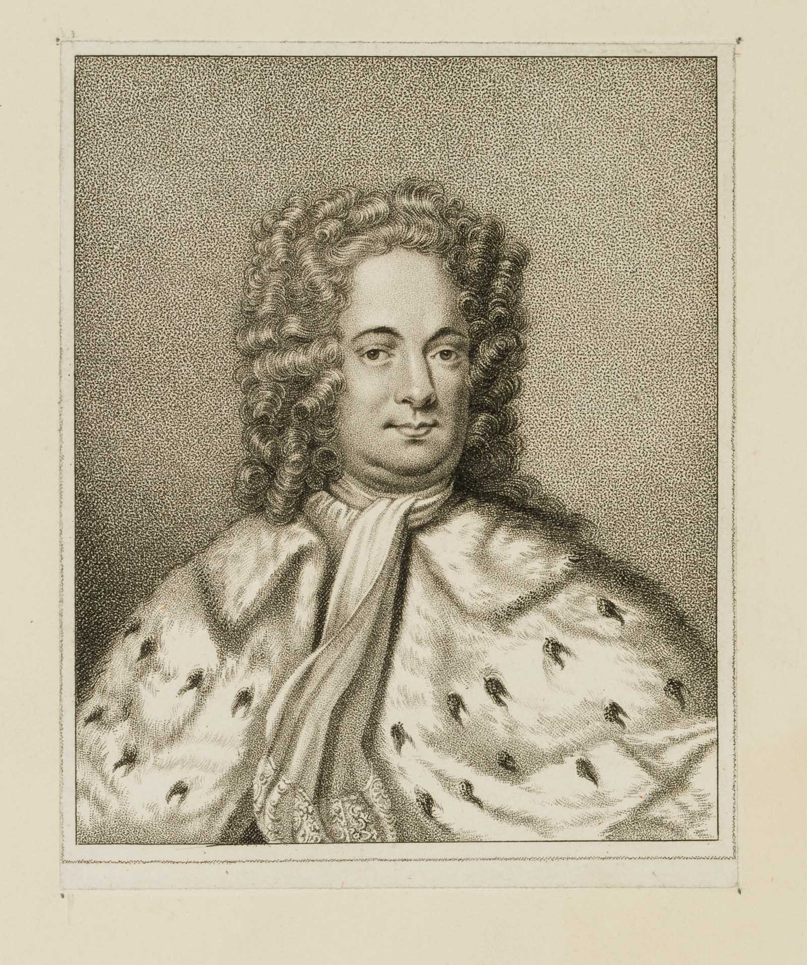 Unknown (18th century), Frontal Breast Portrait of the British Aristocrat William Viscount Grimston, the First (c 1683-1756) with Fur Cloak, 18th century, Stipple engraving