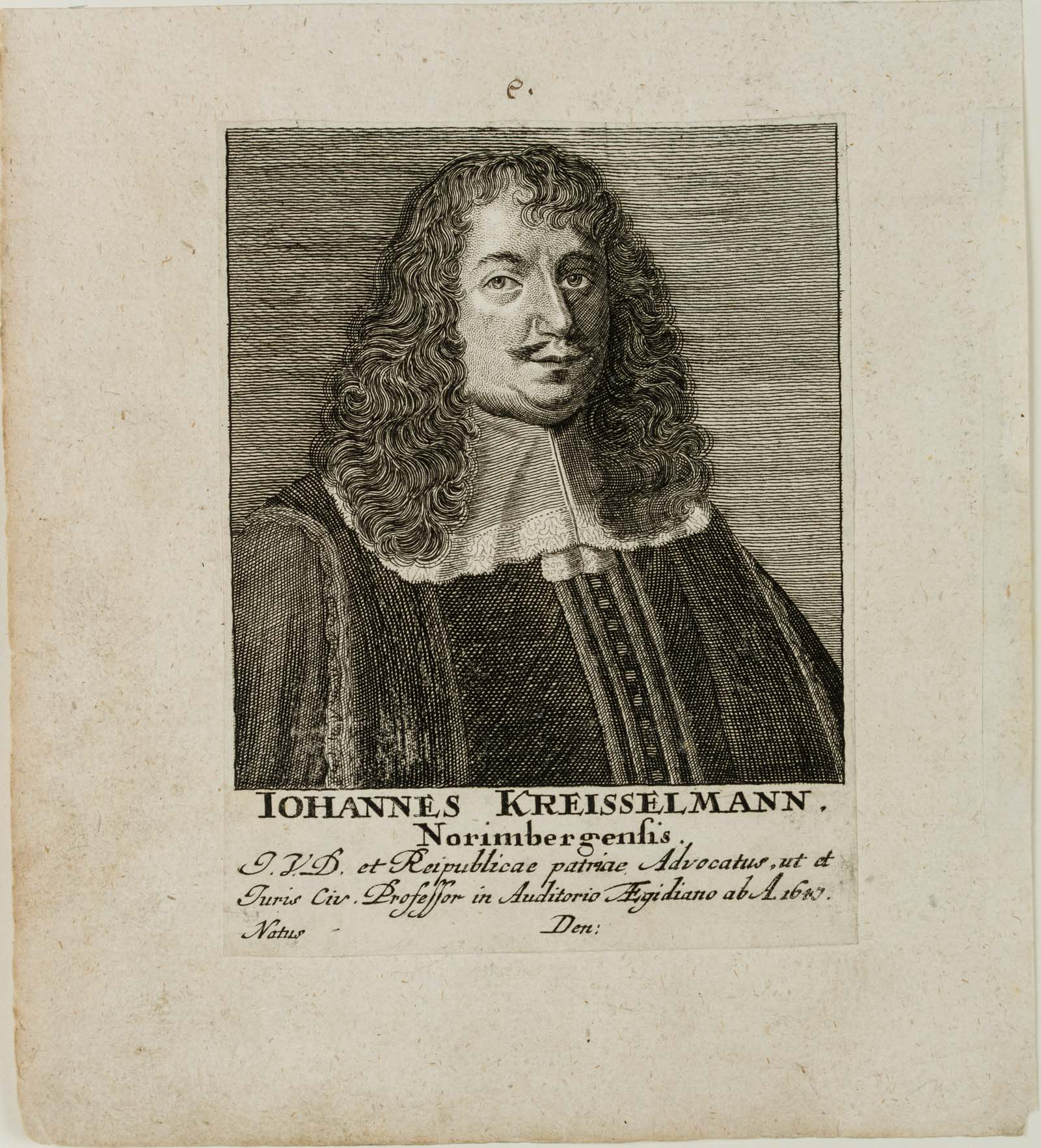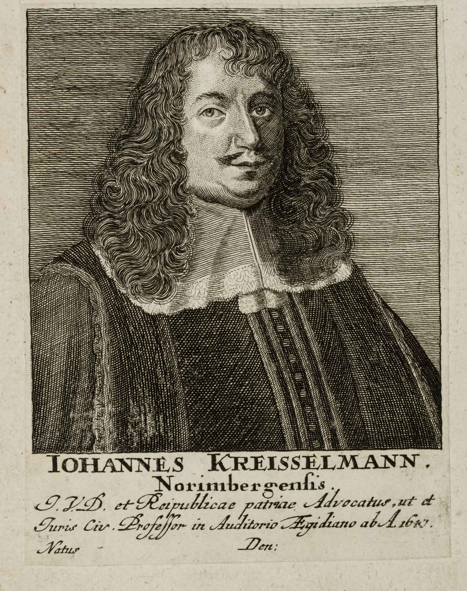 Brustbild des deutschen Juristen und Professors Johann KREISELMANN in Dreiviertelansicht. Der Dargestellte war als Advokat tätig und Professor am Egidianum, Nürnberg, eine der führenden Schulen des protestantischen Deutschlands im 17. Jahrhundert.