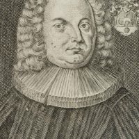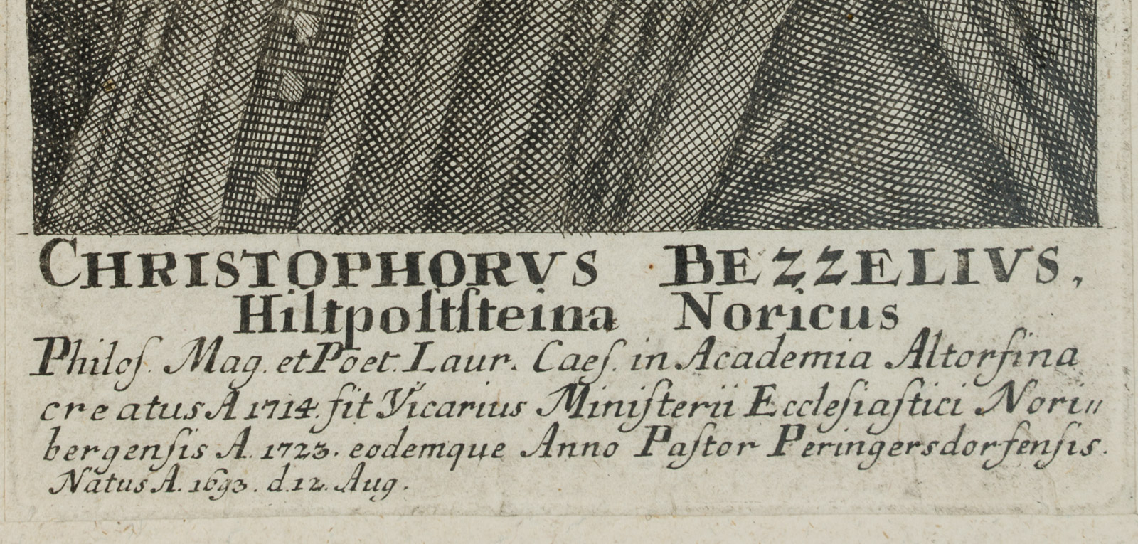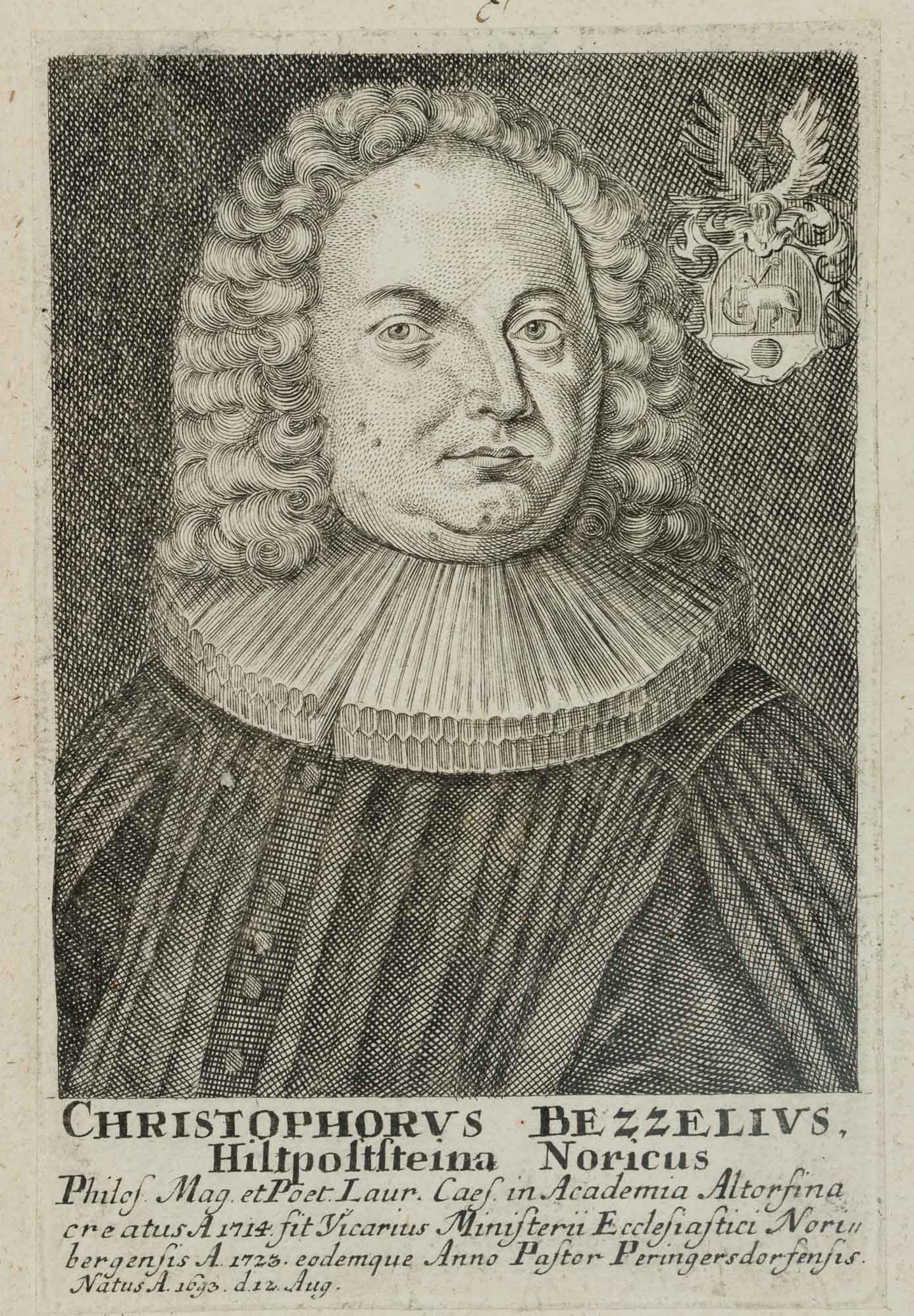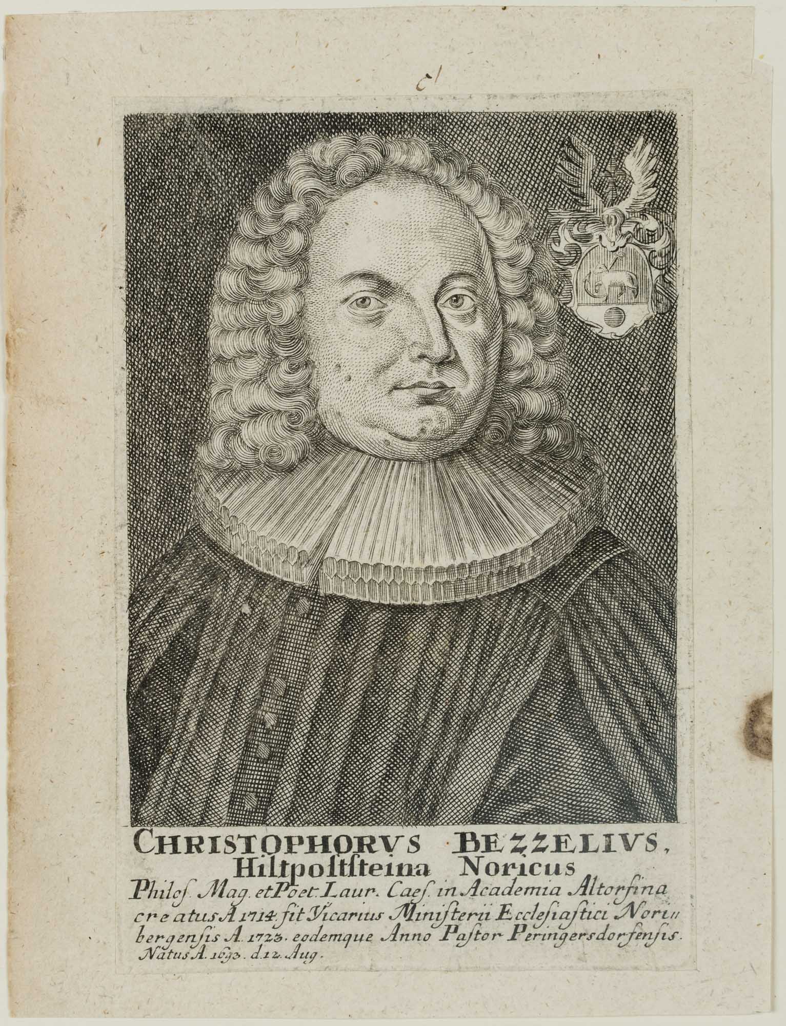 Brustbild des deutschen Theologen Christoph BEZZEL (1693-1740). Er war Magister der Philosophie und kaiserlich gekrönter Poet und Pfarrer in Behringersdorf. Er ist zusammen mit dem Bezzel Wappen dargestellt, in dessen Zentrum sich ein schreitendes silbernes Lamm mit einem schwarzen Anker befindet.