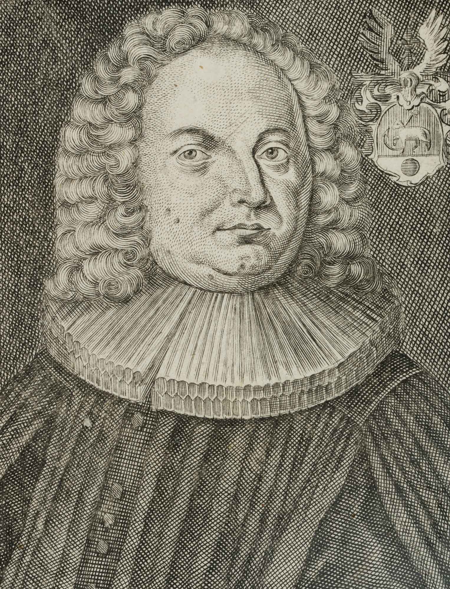 Chest portrait of the German theologian Christoph BEZZEL (1693-1740). He was a master of philosophy and imperially crowned poet and pastor in Behringersdorf. He is depicted together with the Bezzel coat of arms, in the centre of which is a striding silver lamb with a black anchor.