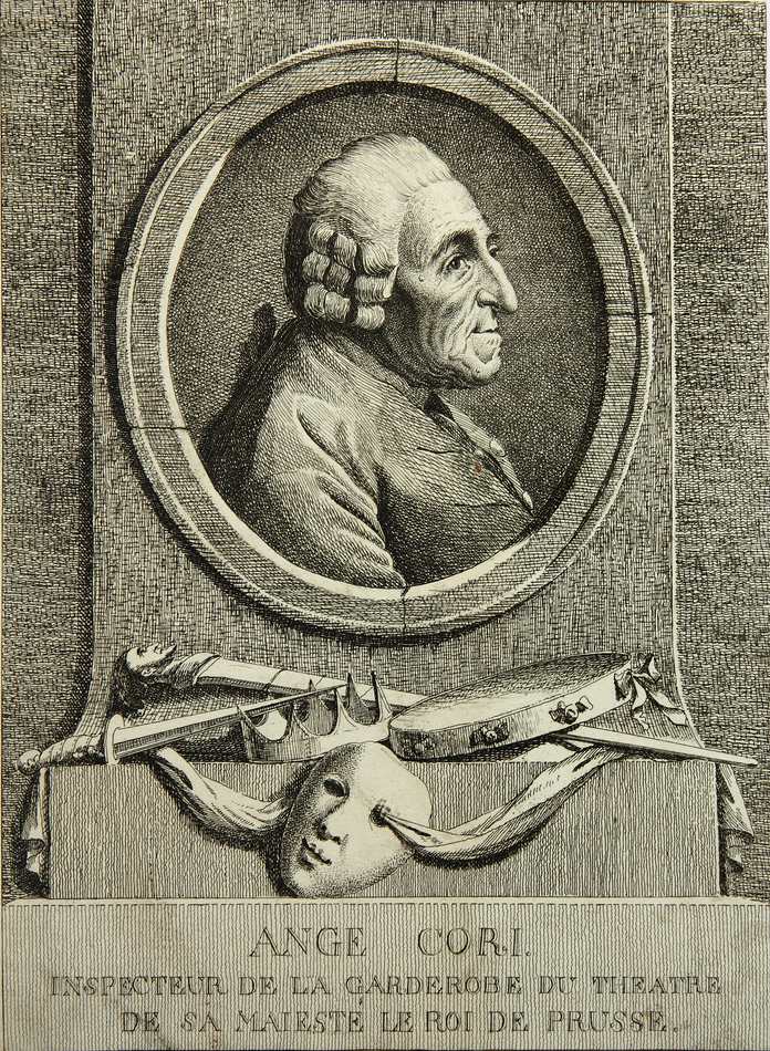 - Description: Portrait in profile in oval frame over individual theatre props. Ange Cori, a native of England, was in charge of the wardrobes in the theatres of Potsdam and Berlin on behalf of the King of Prussia from 1749. He was considered an exceptionally ugly person, which is why his appearance became a proverb in Berlin.