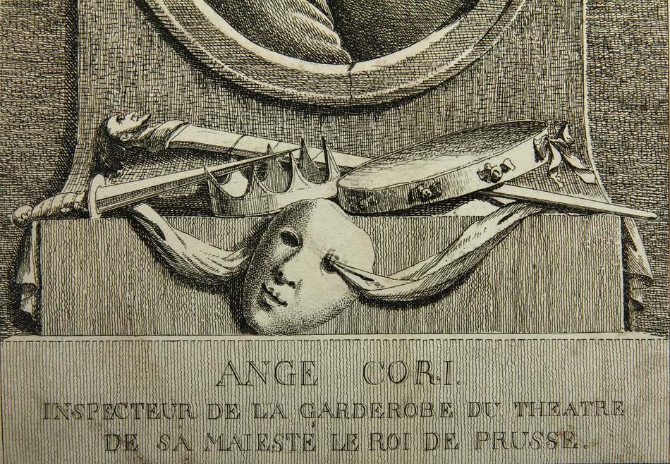 - Beschreibung: Brustbild im Profil in ovalem Rahmen über einzelnen Theaterrequisiten. Der aus England stammende Ange Cori war ab 1749 im Auftrag des Königs von Preußen als Inspekteur der Garderoben in den Theatern von Potsdam und Berlin zuständig. Er galt als ausserordentlich hässlicher Mensch, weshalb sein Aussehen in Berlin zum Sprichwort wurde.