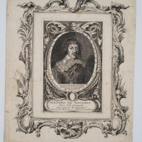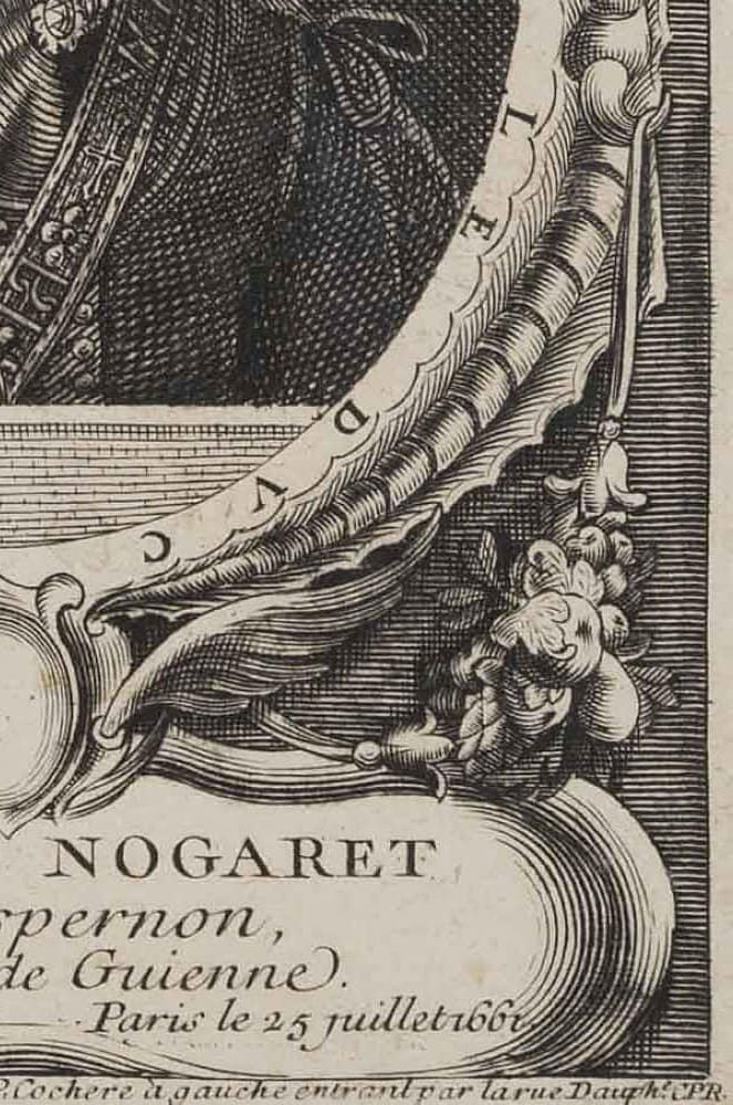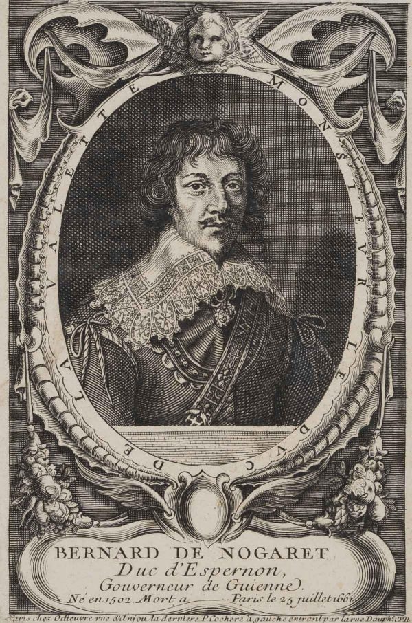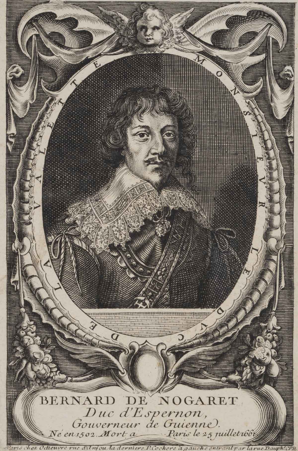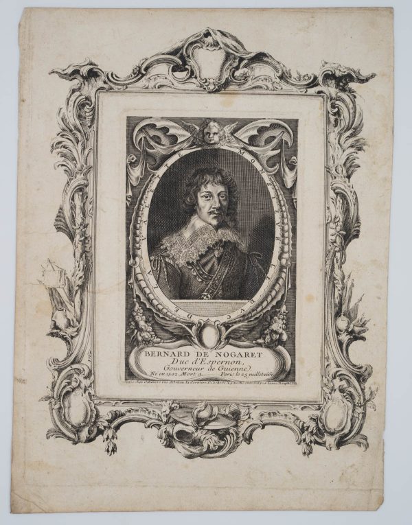 - Description: Half-length portrait in oval. Inscribed with the sitter’s name, biographical details and dates below the portrait and oval around the portrait: “MONSIEUR LE DUC DE LA VALETTE”, “BERNARD DE NOGARET Duc d’Espernon, Gouverneur de Guinne. Né en 1592. Mort a Paris le 25 juillet 1661.”