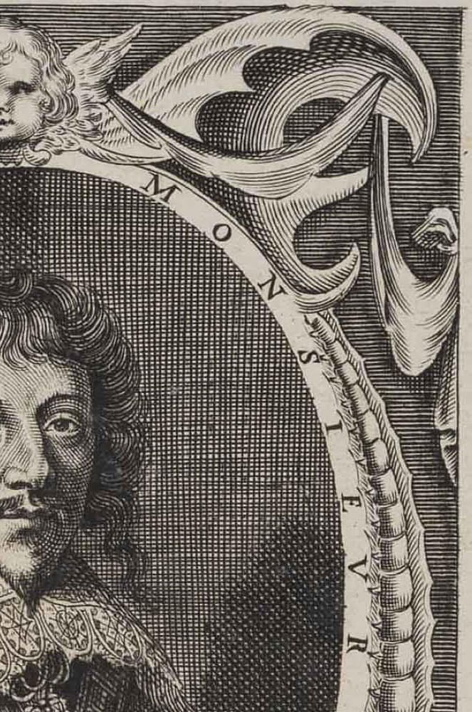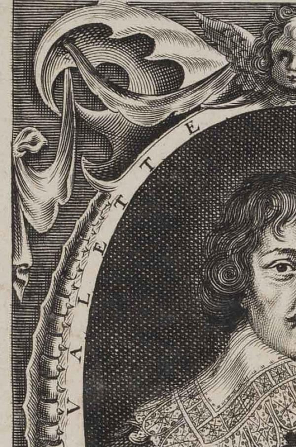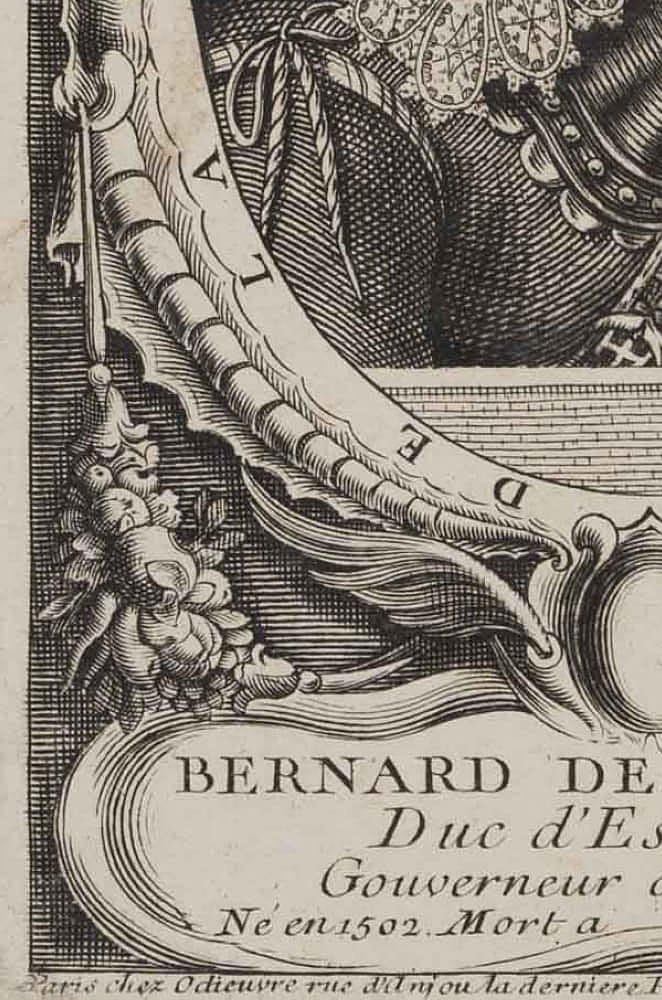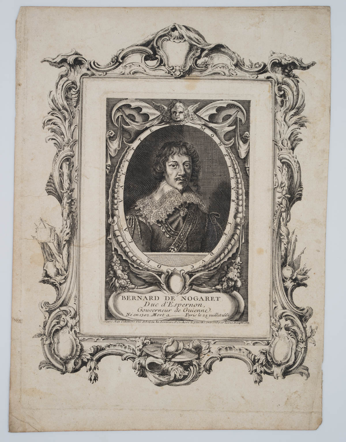 - Beschreibung: Brustbild im Oval. Mit Name, Lebensangaben und -daten des Dargestellten unter dem Porträt und oval um das Porträt beschriftet: “MONSIEUR LE DUC DE LA VALETTE”, “BERNARD DE NOGARET Duc d’Espernon, Gouverneur de Guinne. Né en 1592. Mort a Paris le 25 juillet 1661.”