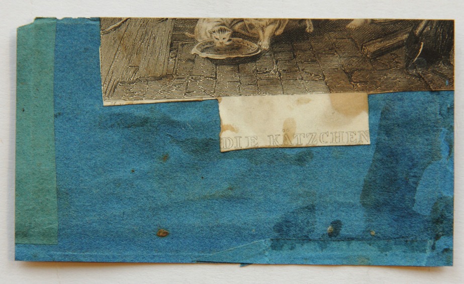 - Bezeichnung: Unterhalb der Darstellung in Druckplatte mit Namen und Titel des Dargestellten versehen. Rückseitig befindet sich der Ausschnitt einer Radierung mit dem Titel “Die Kätzchen”.