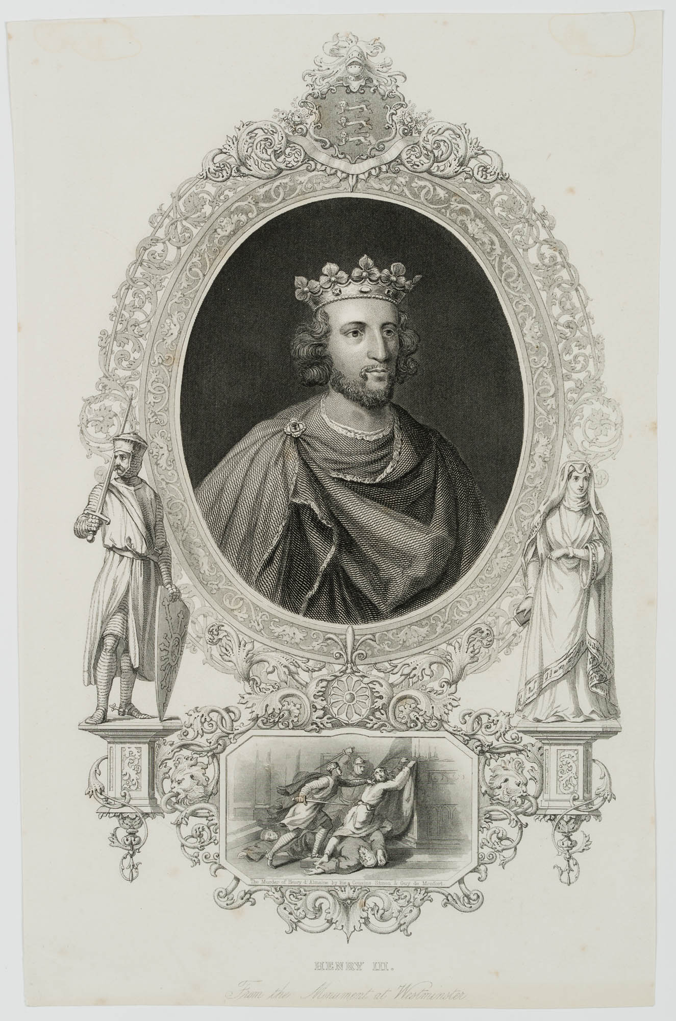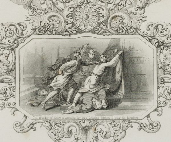 - Inscription: Titled and inscribed “From the Monument at Westminster” below the depiction. Inscribed in the cartouche within the depiction: “The Murder of Henry d’Almaine by his Cousins Simon & Guy de Monfort.