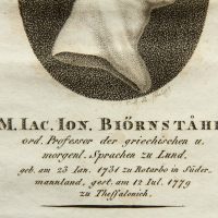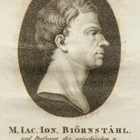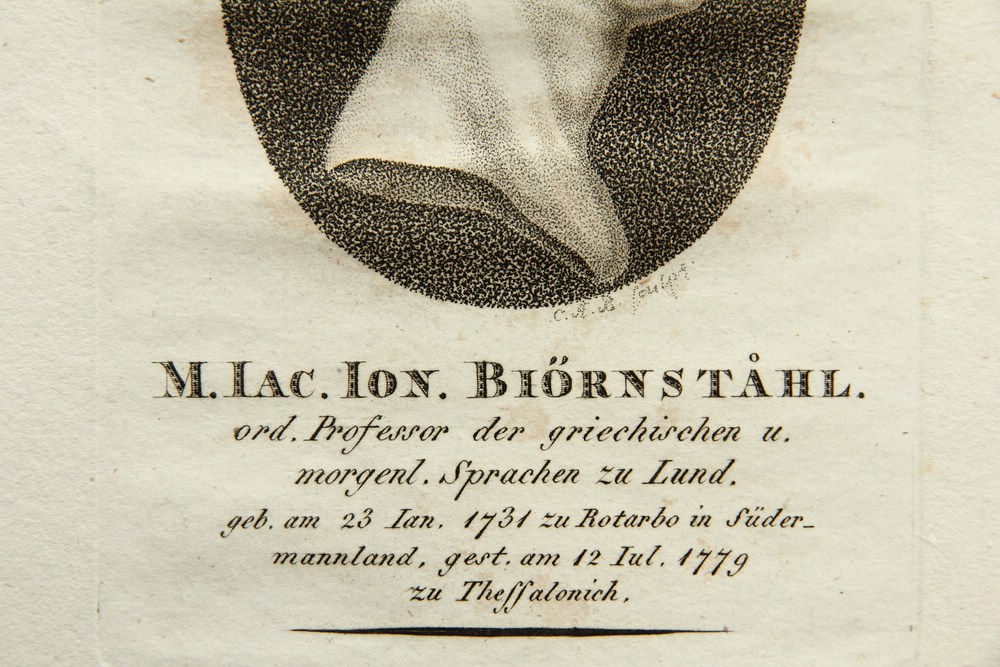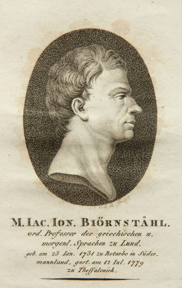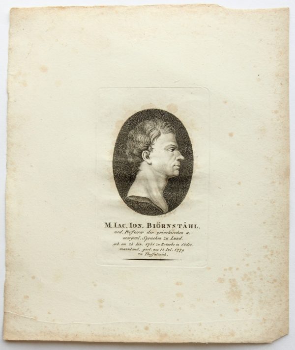 - Beschreibung: Porträt des schwed. Forschungsreisenden J.J. Björnståhl (*1731). Porträt im Profil. Unter dem oval gerahmten Bildnis ist das Porträt in der Druckplatte vom Künstler mit den Initialen “C.A.B.” signiert und mit Namen und Lebensdaten des Dargestellten bezeichnet.