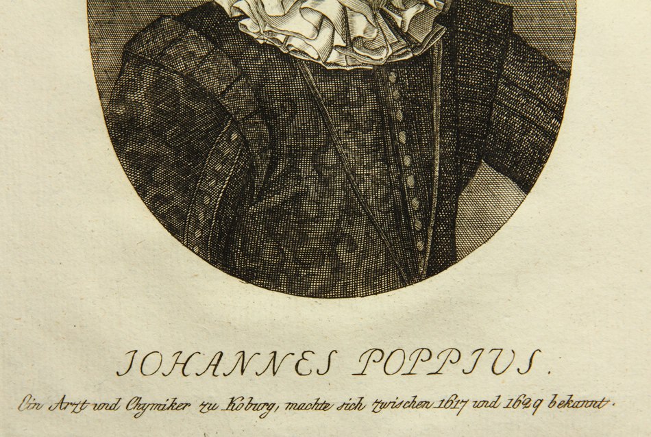 - Bezeichnung: Unterhalb der Darstellung mit dem Namen des Dargestellten bezeichnet sowie mit “Ein Arzt und Chymiker zu Koburg, machte sich zwischen 1617 und 1629 bekannt.”.