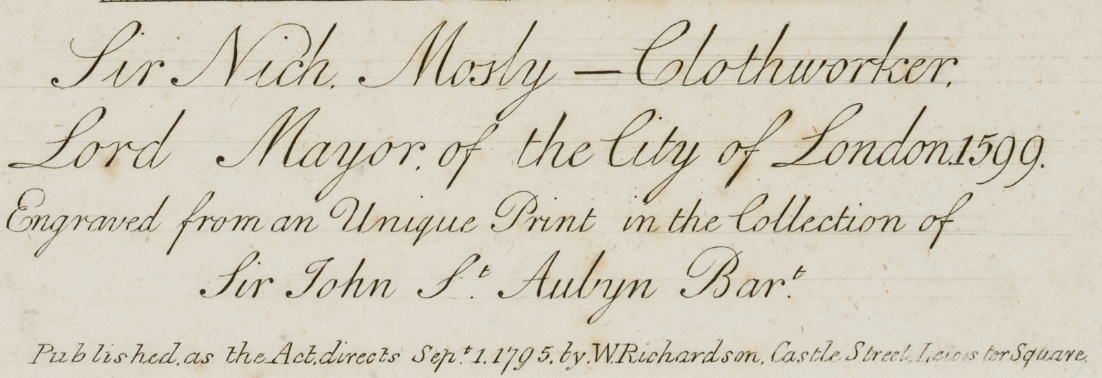 - Inscription: Titled and inscribed below the image in the printing plate: “Published as the Act. directs Sept. 1.1795 by W. Richardson. Castle Street Leicester Square.”