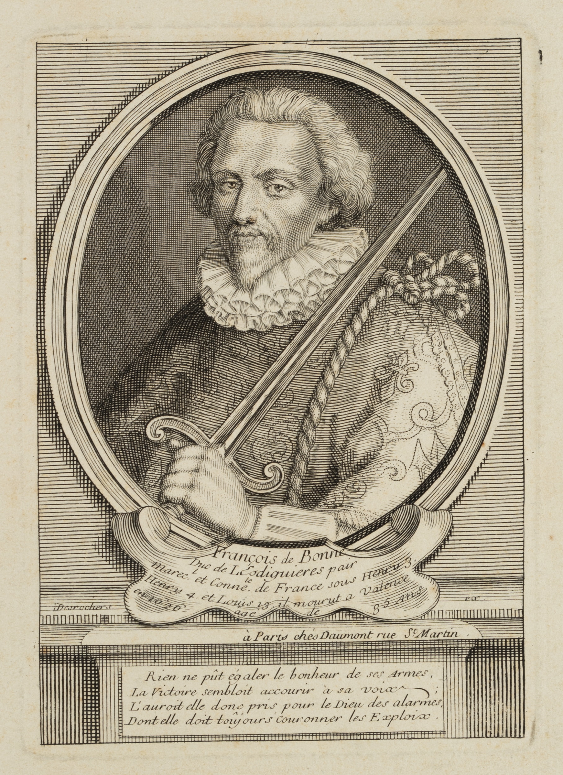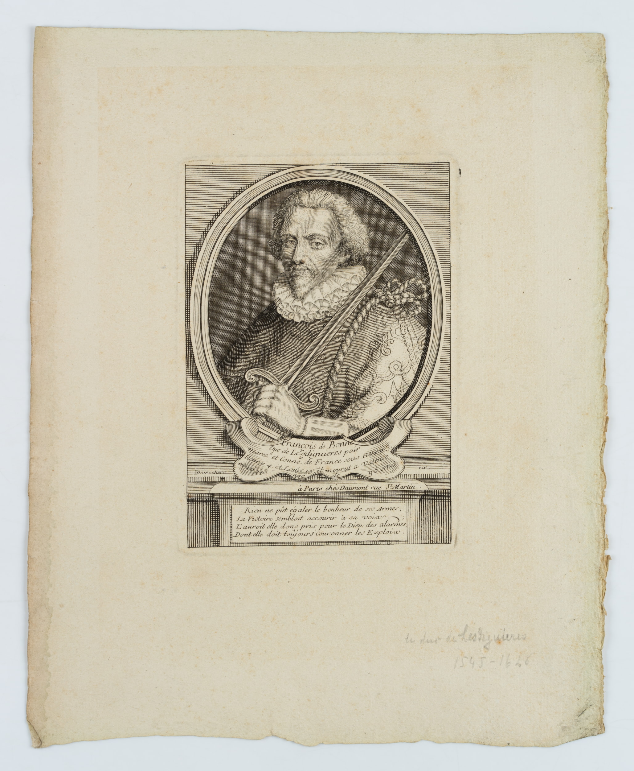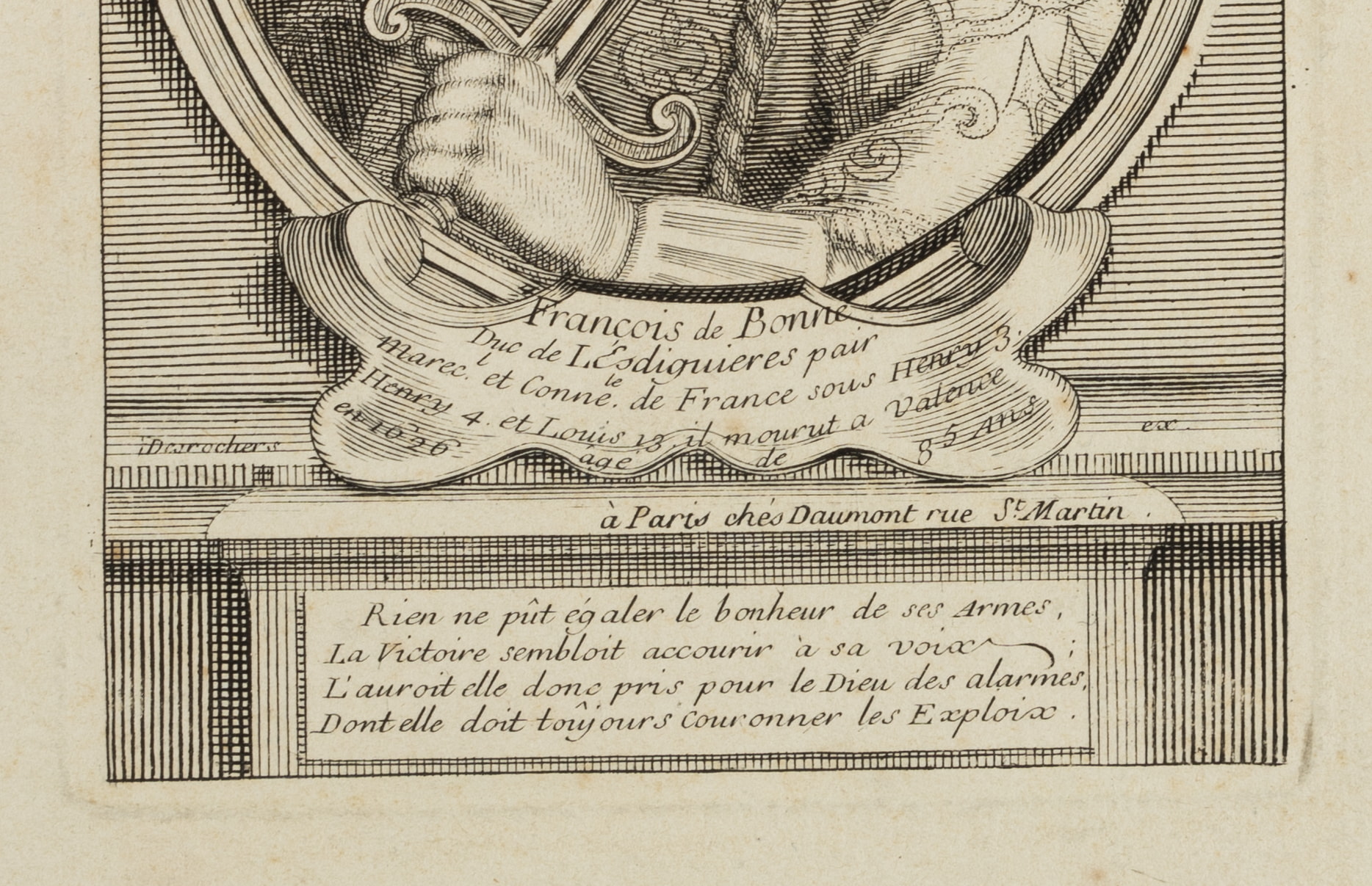 • Inscription: At the center inscribed in the printing plate: “Francois de Bonne. Duc de Lesdiguières pair marecet conne de France sous Henry 3. Henry 4 et Louis 13 . Il mourut a Valence en 1626 age de 85 ans.”.