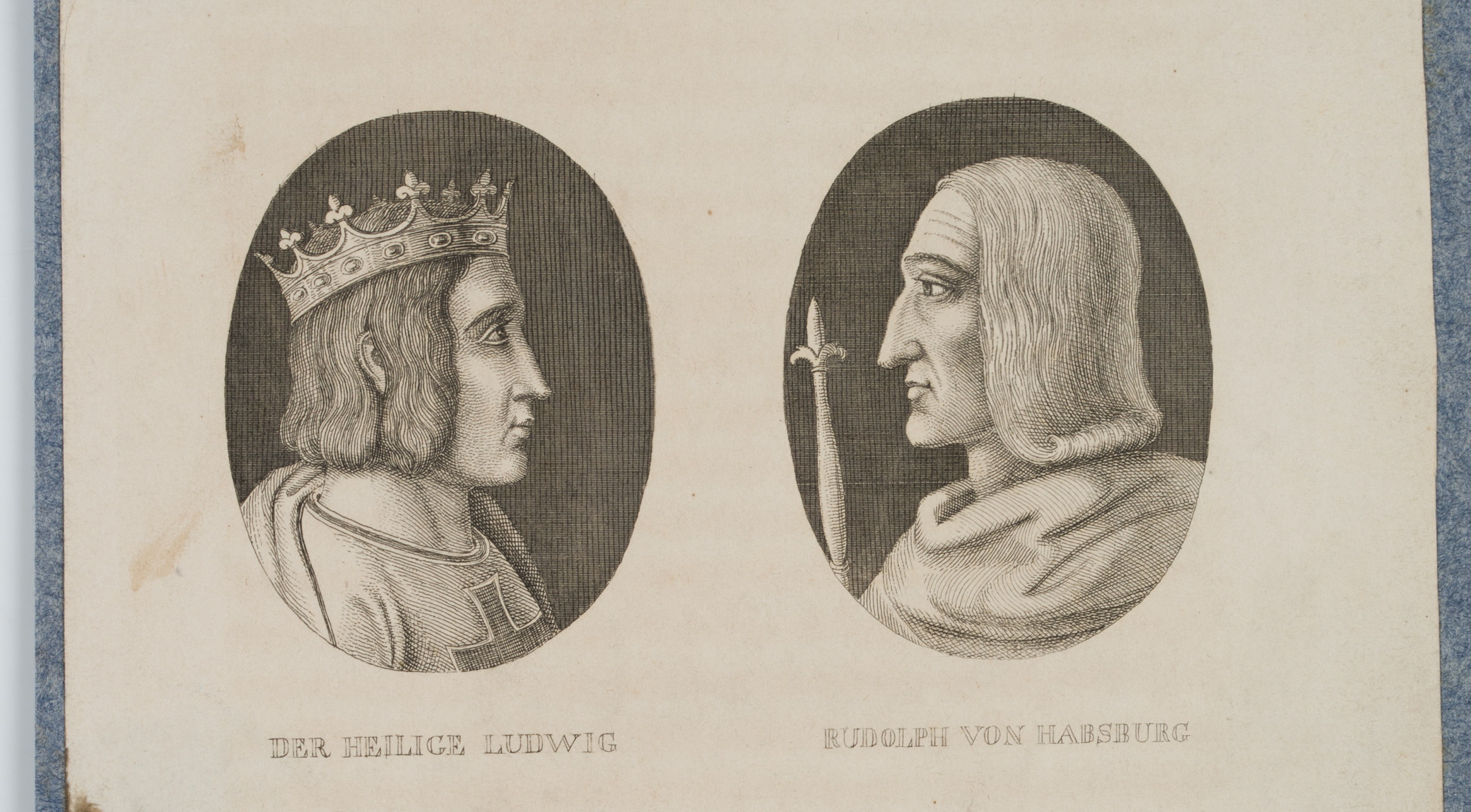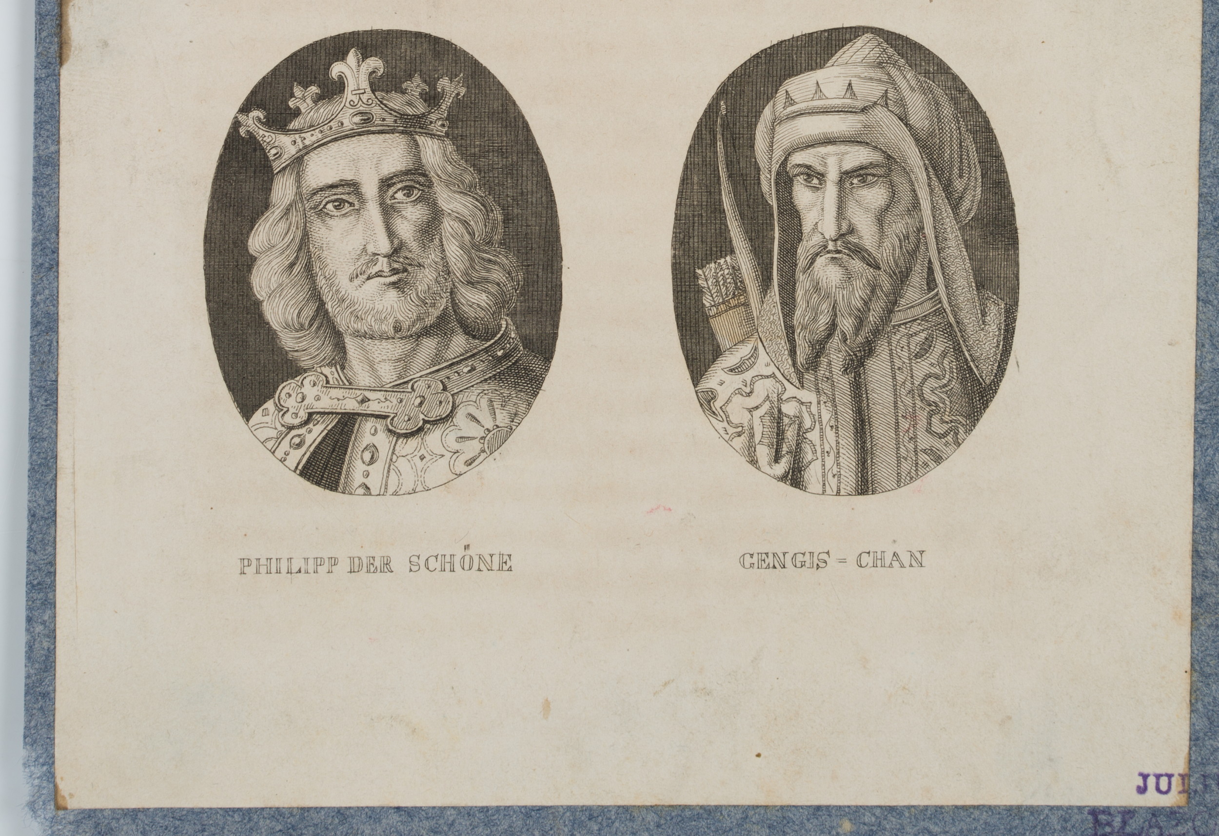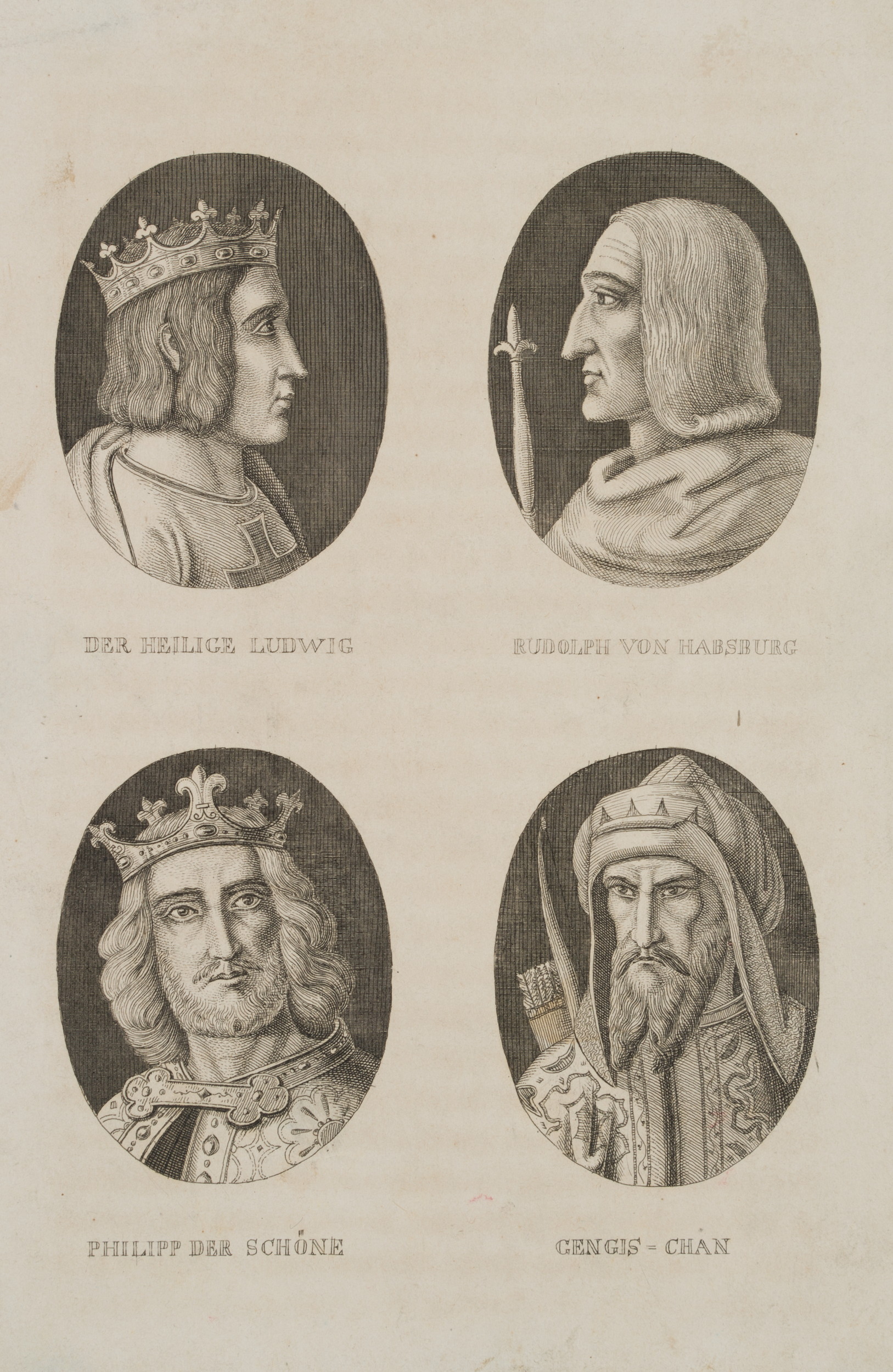 • Inscription: At the center inscribed in the printing plate: “Der heilige Ludwig | Rudolph von Habsburg | Philipp der Schöne | Gengis = Chan”.