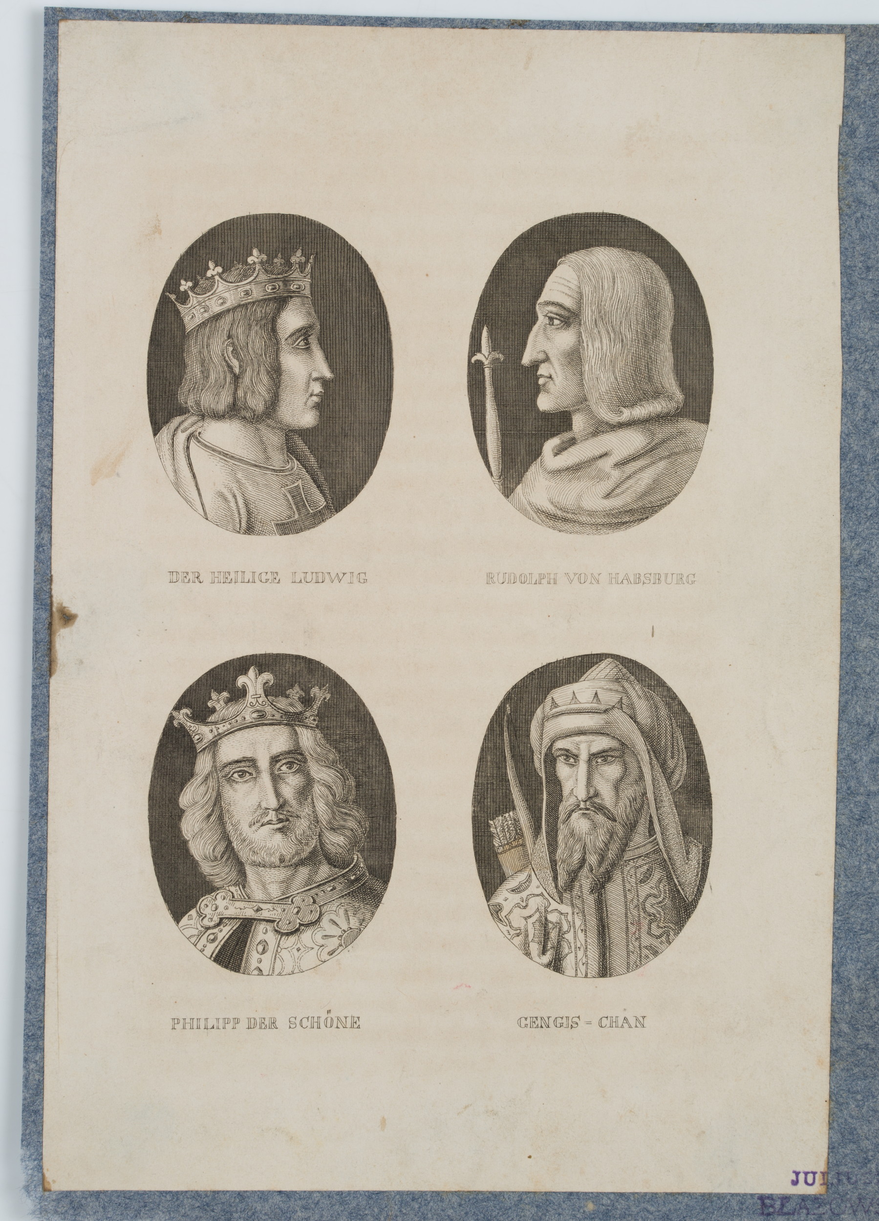 • Bezeichnung: Mittig im Druck bezeichnet: “Der heilige Ludwig | Rudolph von Habsburg | Philipp der Schöne | Gengis = Chan”.