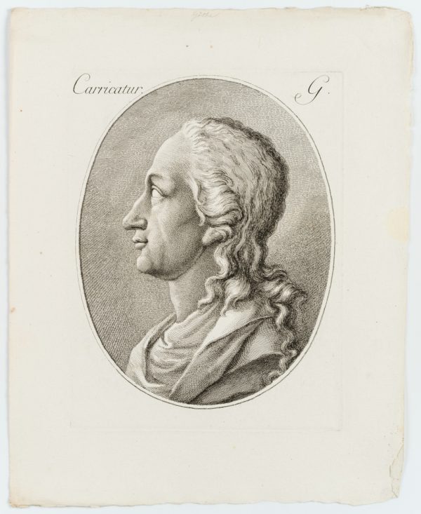- Description: Portrait of a bust in profile of a young man. Inscribed on the side of the printing plate at the top: “Carricatur G.”. Possibly a caricature of Goethe.