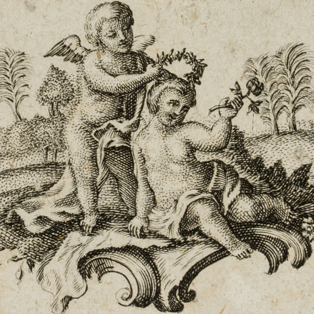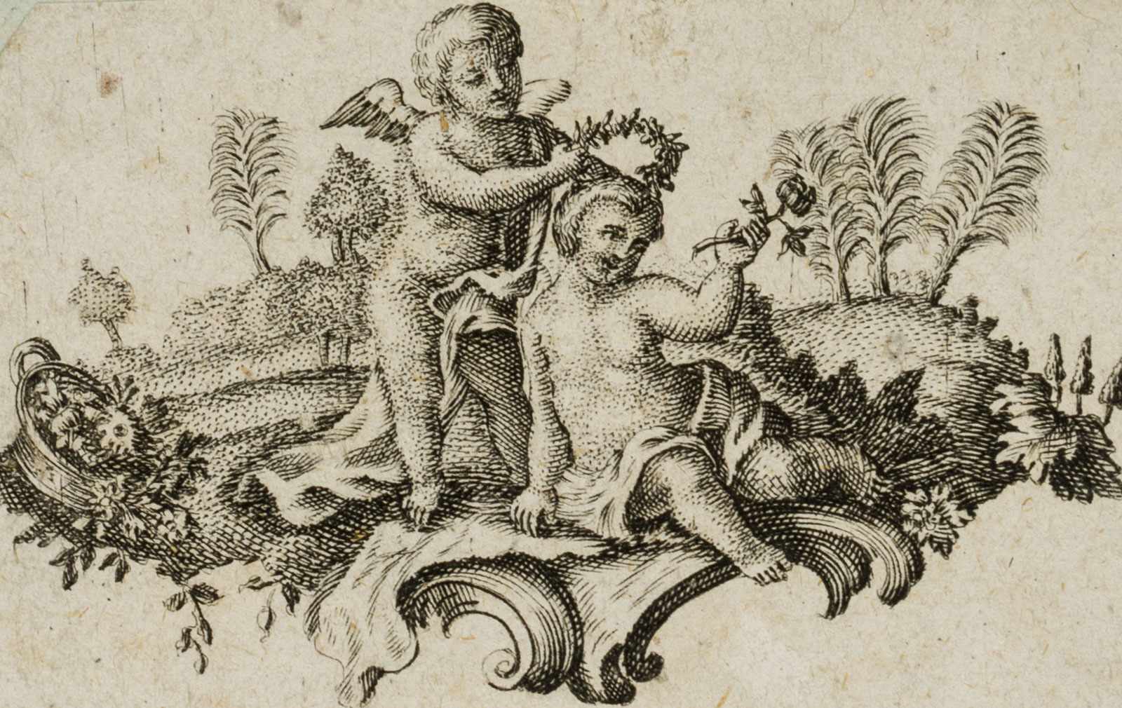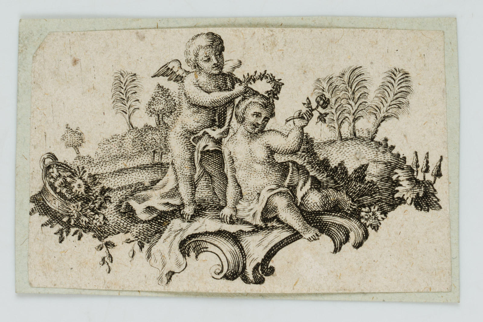 • Description: Two putti in a splendid fantasy landscape. One putto places a wreath on the head of another sitting on a rocaille element. The latter holds a rose in his hand.