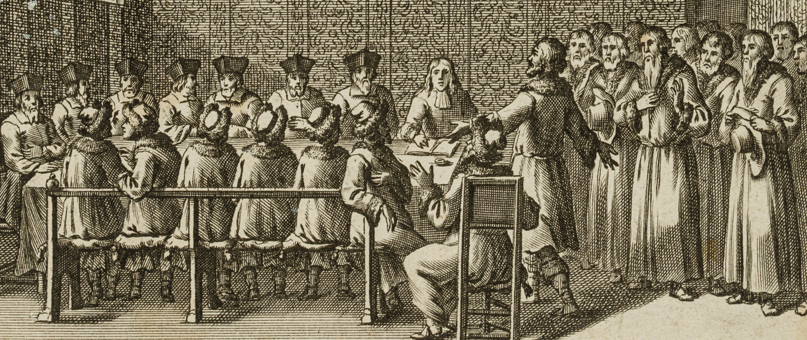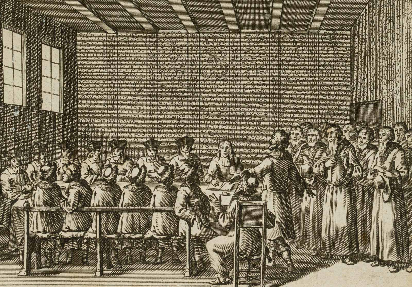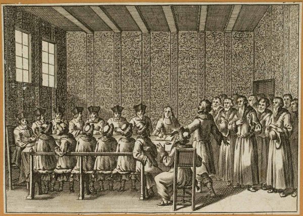 Unbekannt (18. Jahrhundert), Redner in einer Konventsversammlung mit verschiedenen Kirchenvertretern, 18. Jahrhundert, Kupferstich