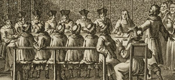 - Description: Various groups of church representatives have gathered around a speaker in the middle. The speaker makes his point in sign language. This could be the theologian Jan Hus (1330-1415) before the Council of Constance. He propagated a new doctrine of the church and was condemned and burned at the Council of Constance as a result.