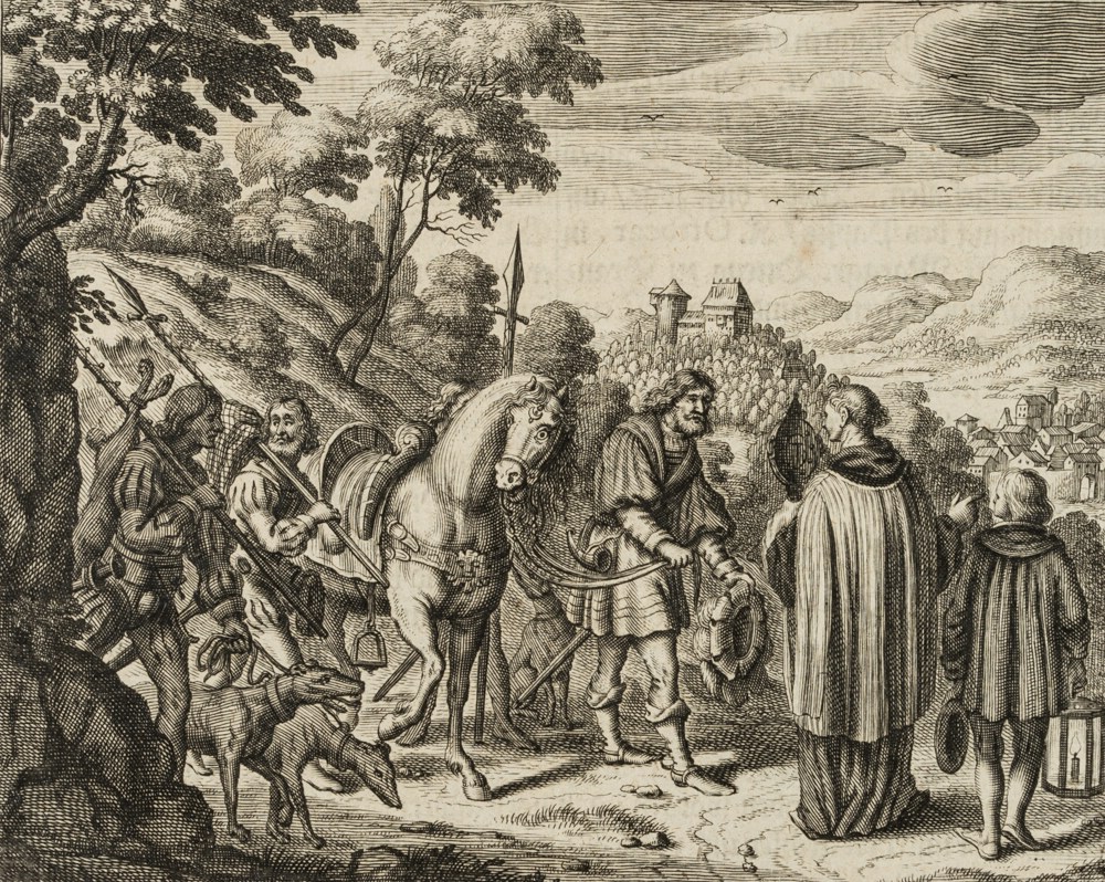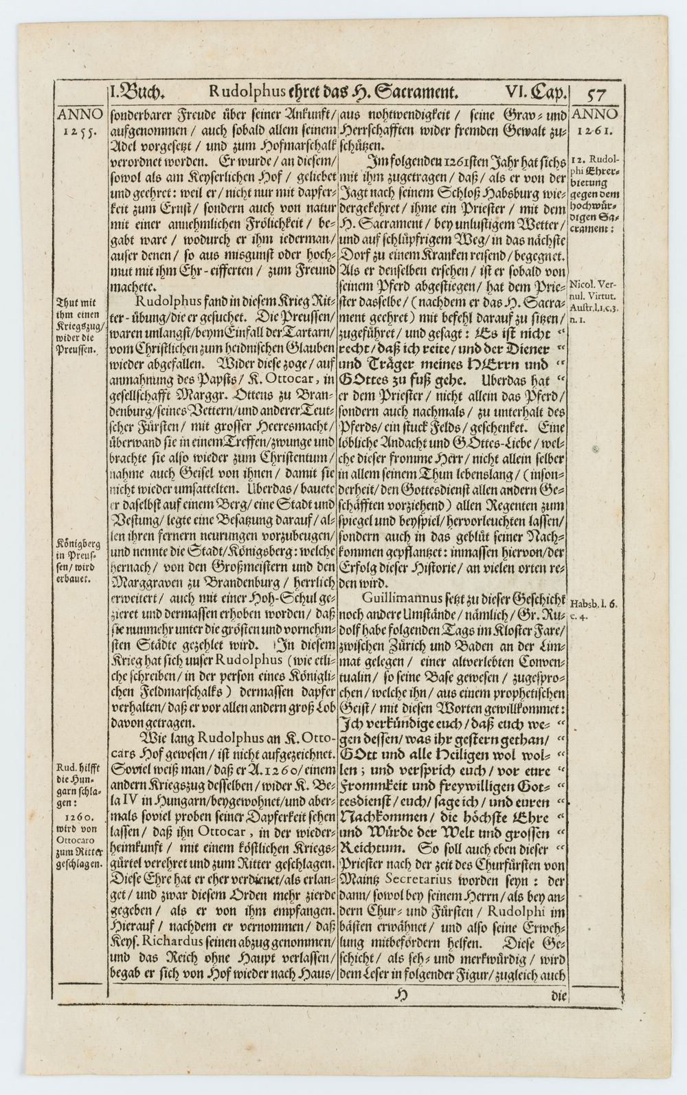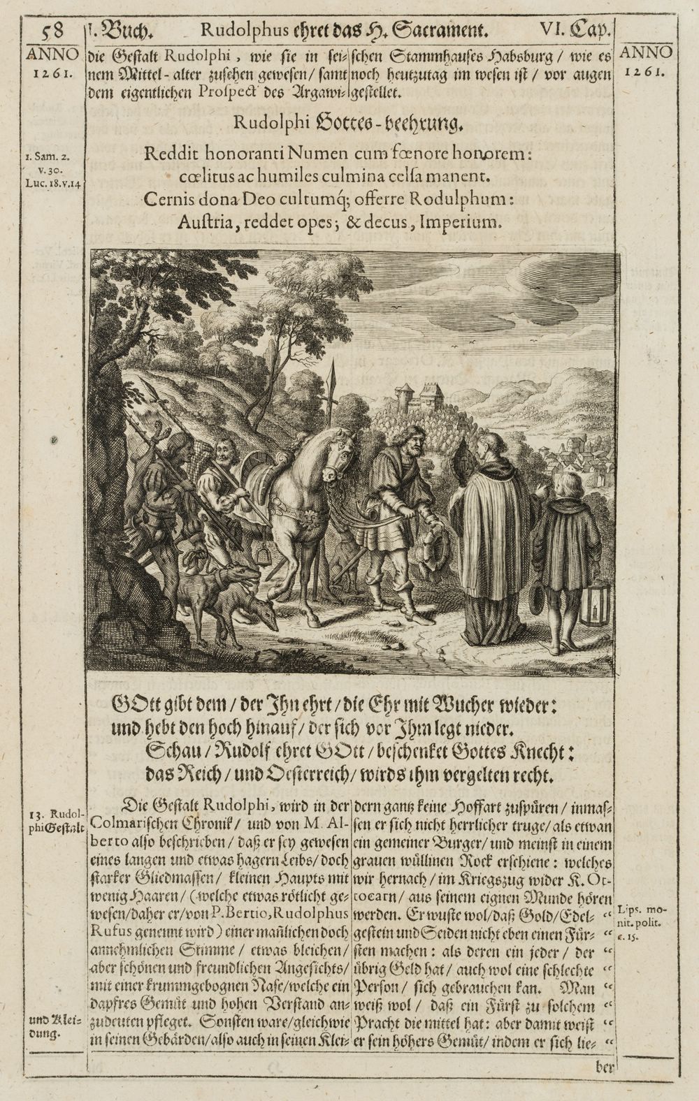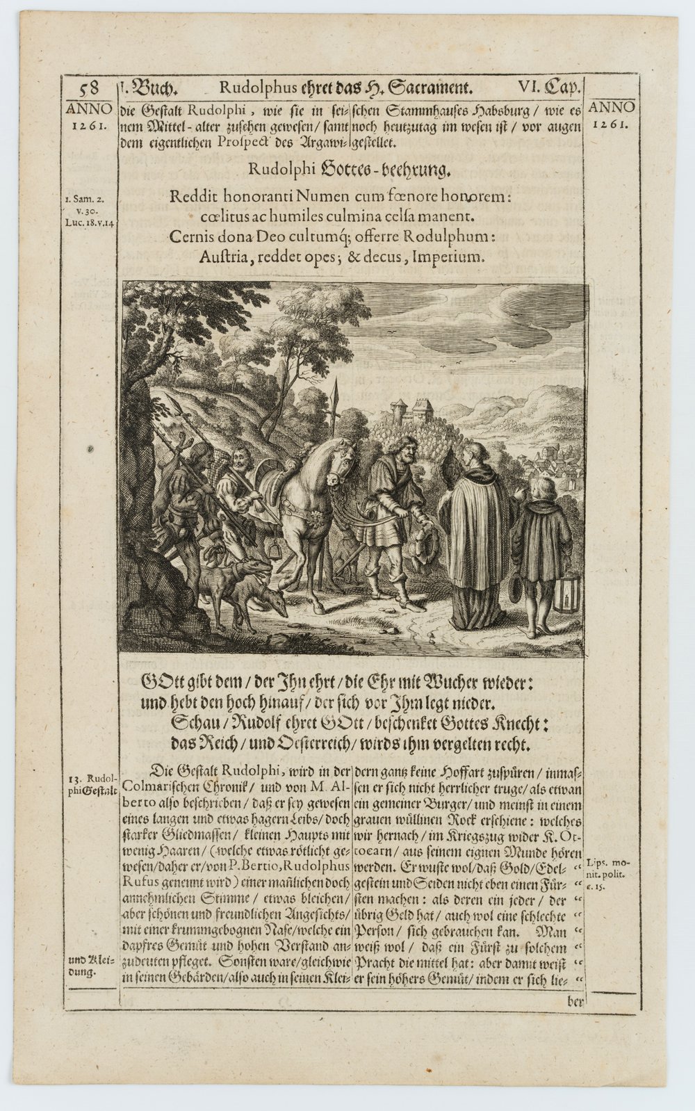 - Beschreibung: Kupferstich und beidseitiger typographischer Druck auf Papier. Aus dem Werk Spiegel der Ehren des Höchstlöblichsten Kayser- und Königlichen Erzhauses Oesterreich oder Ausführliche GeschichtSchrift von Desselben, und derer durch Erwählungs- Heurat- Erb- und Glücks-Fälle ihm zugewandter Kayserlichen HöchstWürde, Königreiche, Fürstentüm er, Graf- und Herrschaften, Erster Ankunft, Aufnahme, Fortstammung und hoher Befreundung mit Kayser- König- Chur- und Fürstlichen Häusern : auch von derer aus diesem Haus Erwählter Sechs Ersten Römischen Käysere.. Ihrer Nachkommen und Befreundten, Leben und Großthaten, mit Käys. Rudolphi I GeburtsJahr 1212 anfahend, und mit Käys. Maximiliani I TodesJahr 1519 sich endend von Johann Jakob Fugger und Sigmund von Birken, das 1668 in Nürnberg veröffentlicht wurde. Daraus aus dem I. Buch, Rudolphus ehret das H. Sacrament, VI. Kapitel, S. 58.