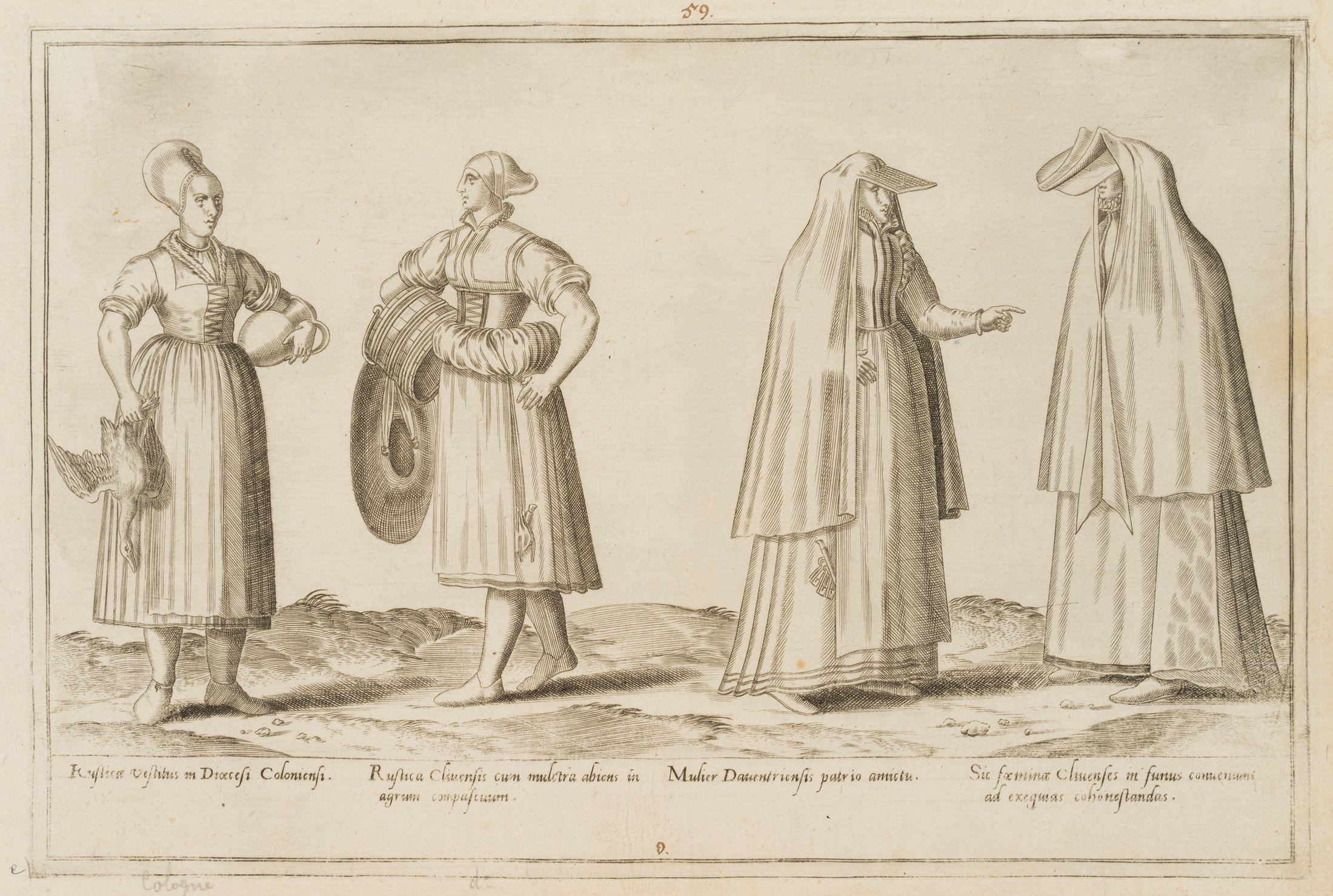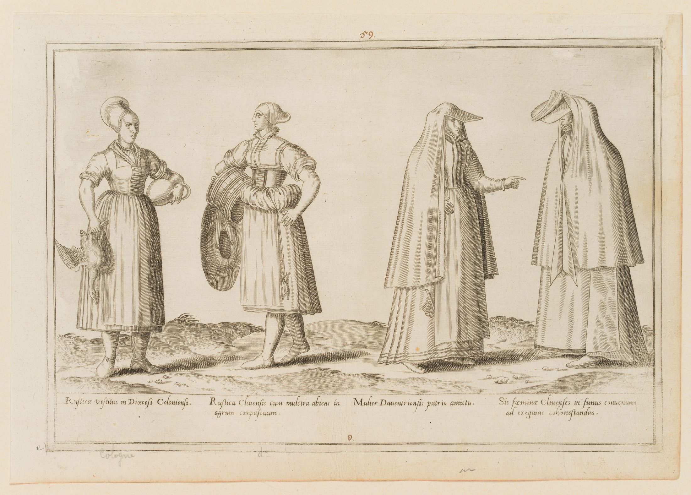 - Inscription: Inscribed “Rusticæ vestitus in Diœcesi Coloniensi [.]” below the depiction, numbered “59” at the top centre.