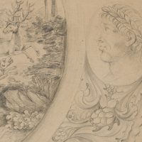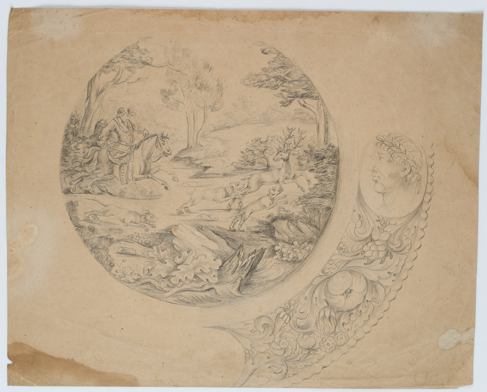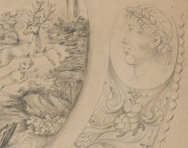Unbekannt (18. Jahrhundert), Schießscheibenentwurf oder Entwurf für einen Scheibenriß, Hirschhatz, um 1790, Bleistift