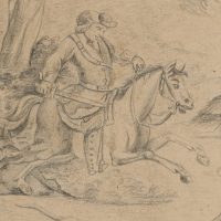 - Description: Hunting scene in the forest with deer and hounds. Such hunting panes were usually designed with images of huntable game species such as chamois, deer, foxes or wild boar. It is also possible that this is a disc outline, i.e. a preparatory drawing for a glass painting. Stained glass flourished from the 15th to the 17th century, which is also based on the custom of donating small stained glass paintings to each other to indicate alliances, appointments to offices or friendships. It is known that Albrecht Dürer and the artists Hans v. Kulmbach and H. Baldung Grien, who were active in his circle, as well as H. Holbein, produced designs for plate cracks. Literature: Ariane Mensger: Die Scheibenrisse der Staatlichen Kunsthalle Karlsruhe, Cologne 2012.