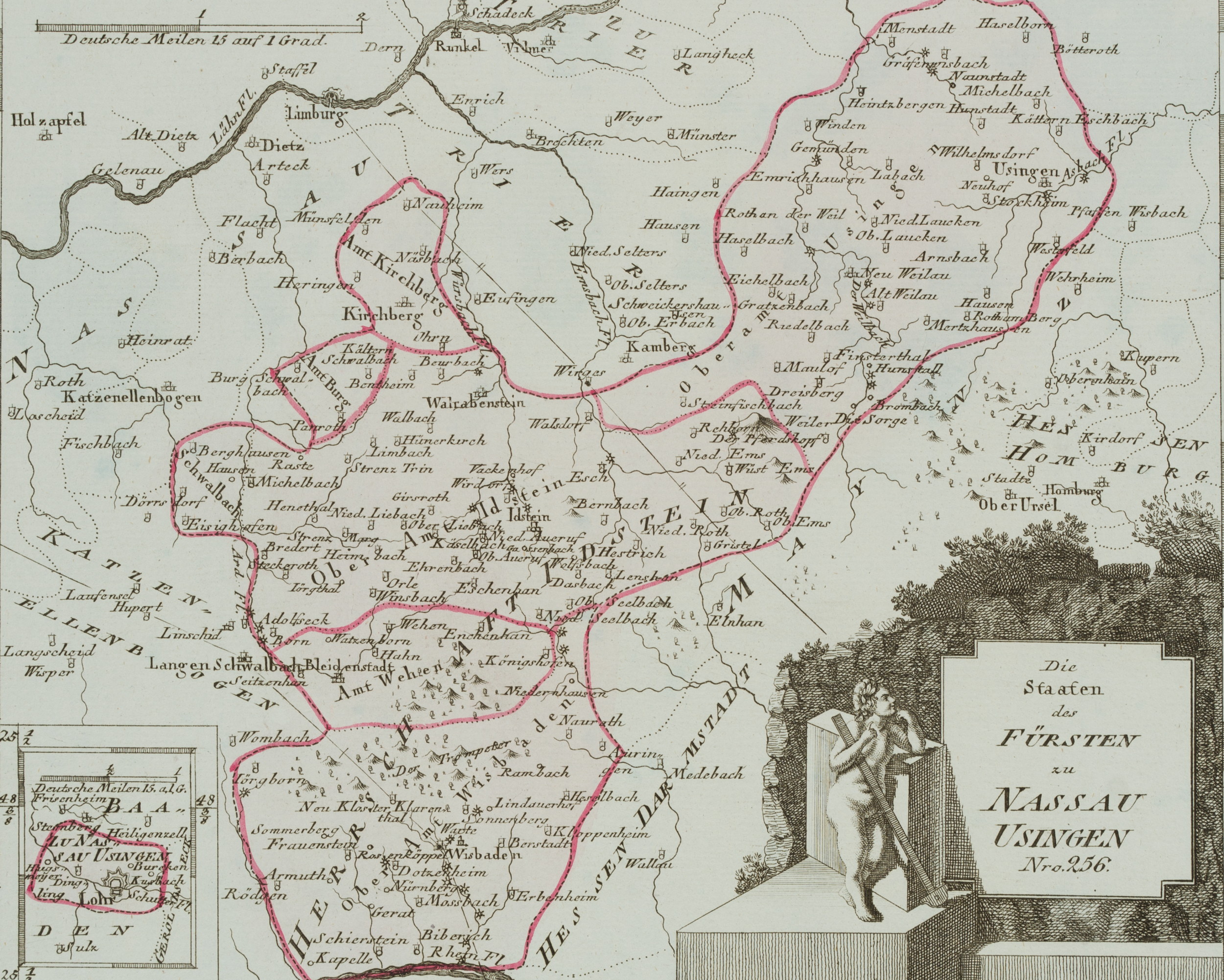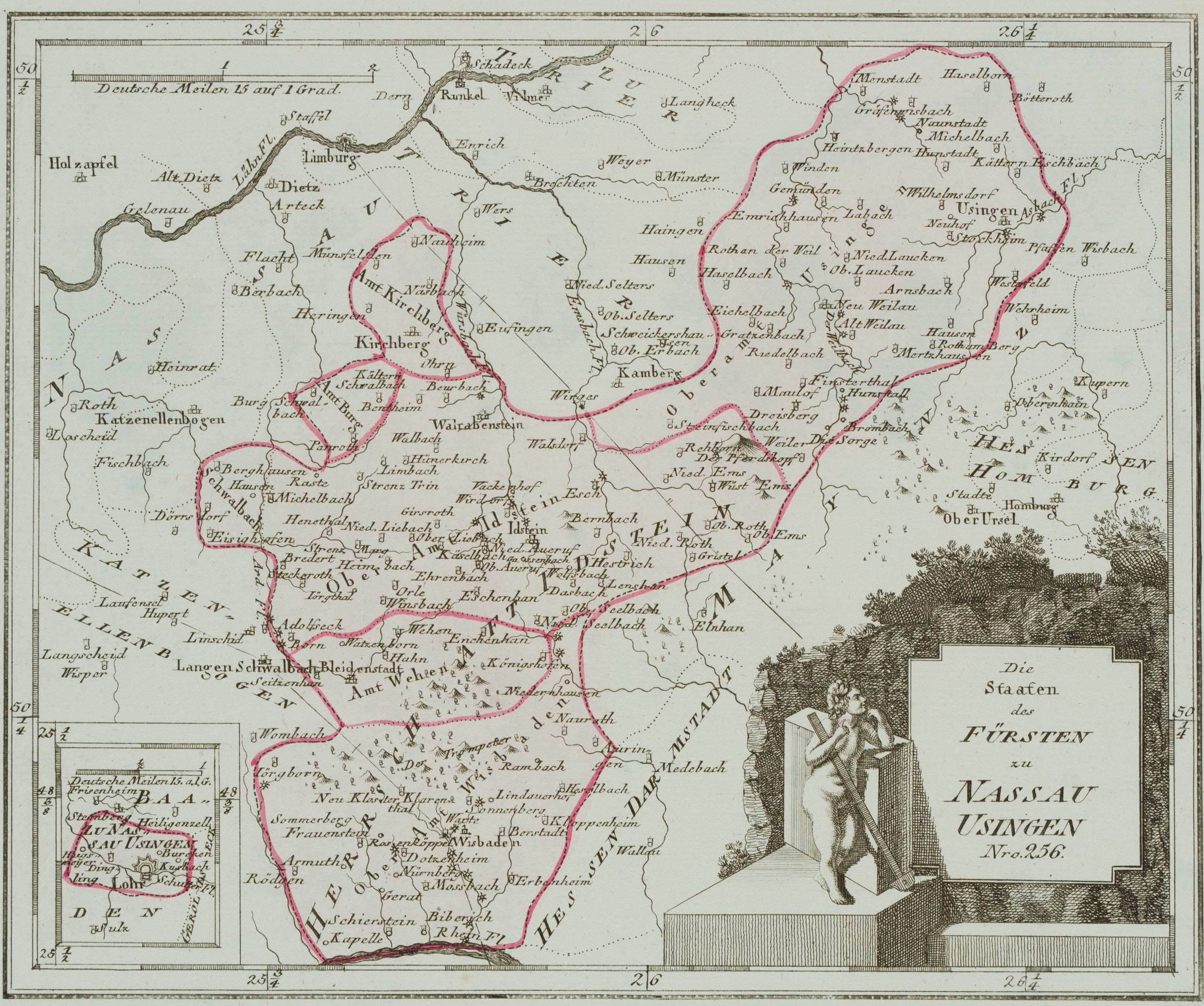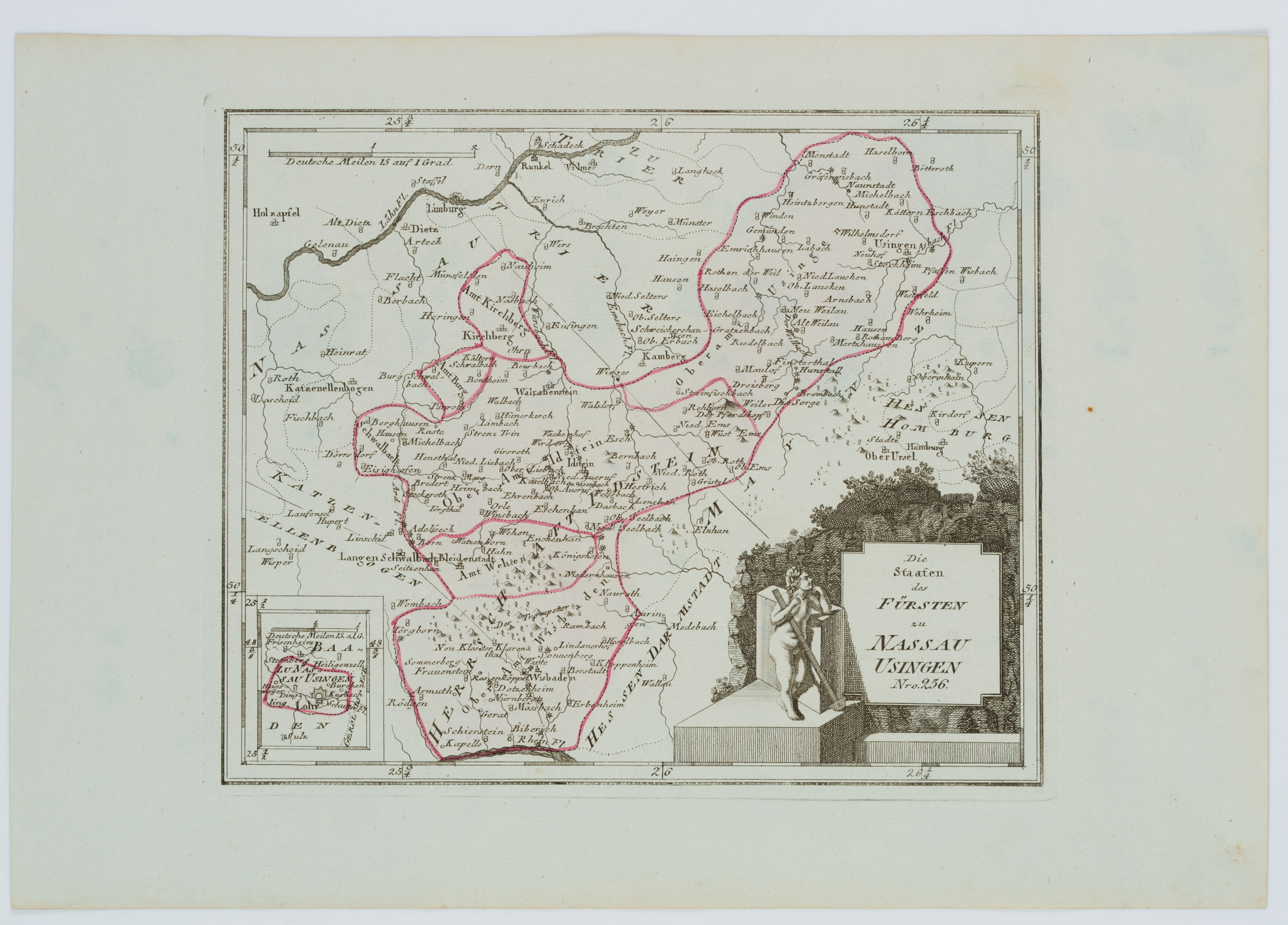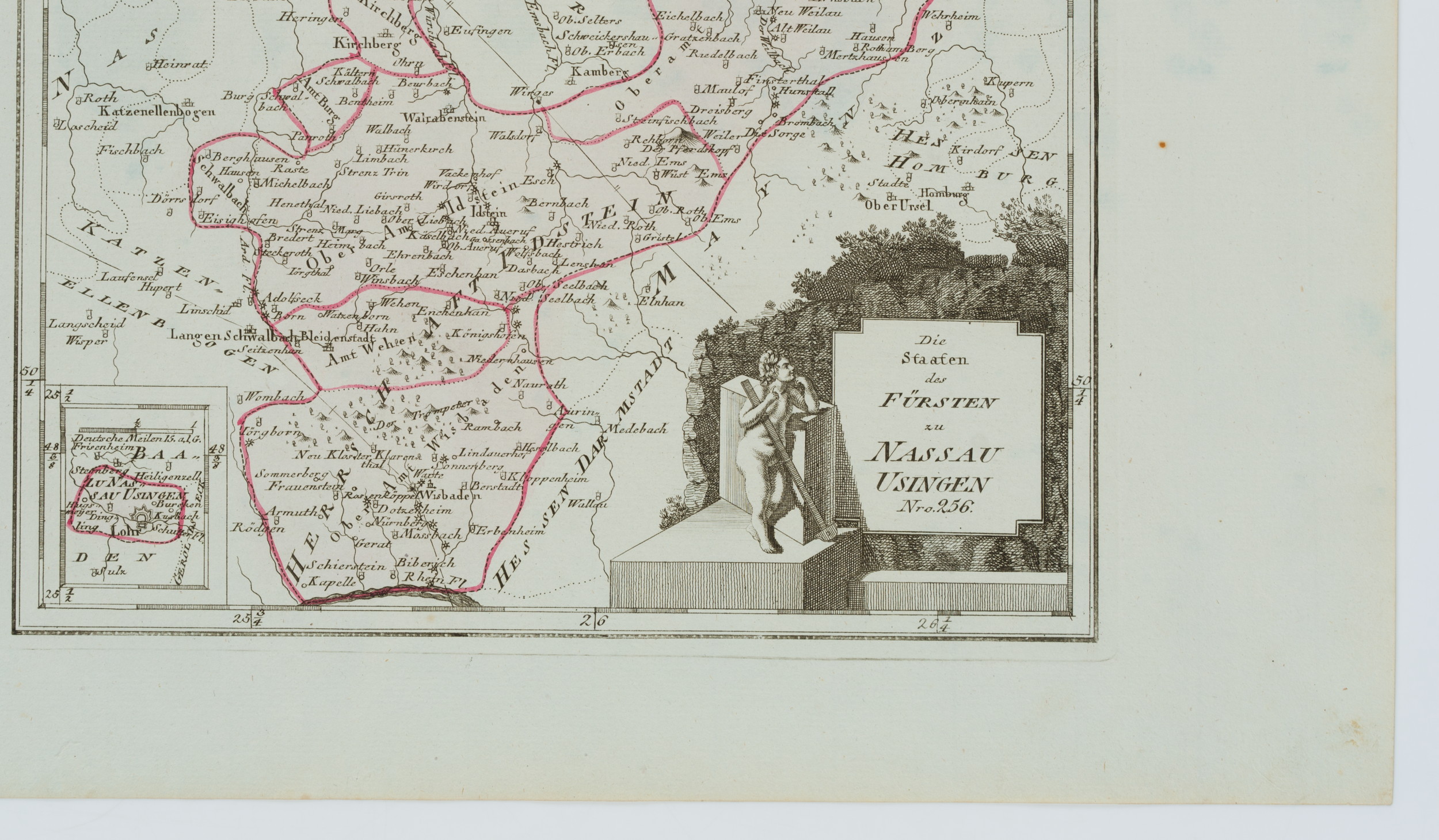 • Inscription: Lower right inscribed in the printing plate: “Die Staaten des Fürsten zu Nassau Usingen”. Lower right numbered in the printing plate: “Nro. 256”.