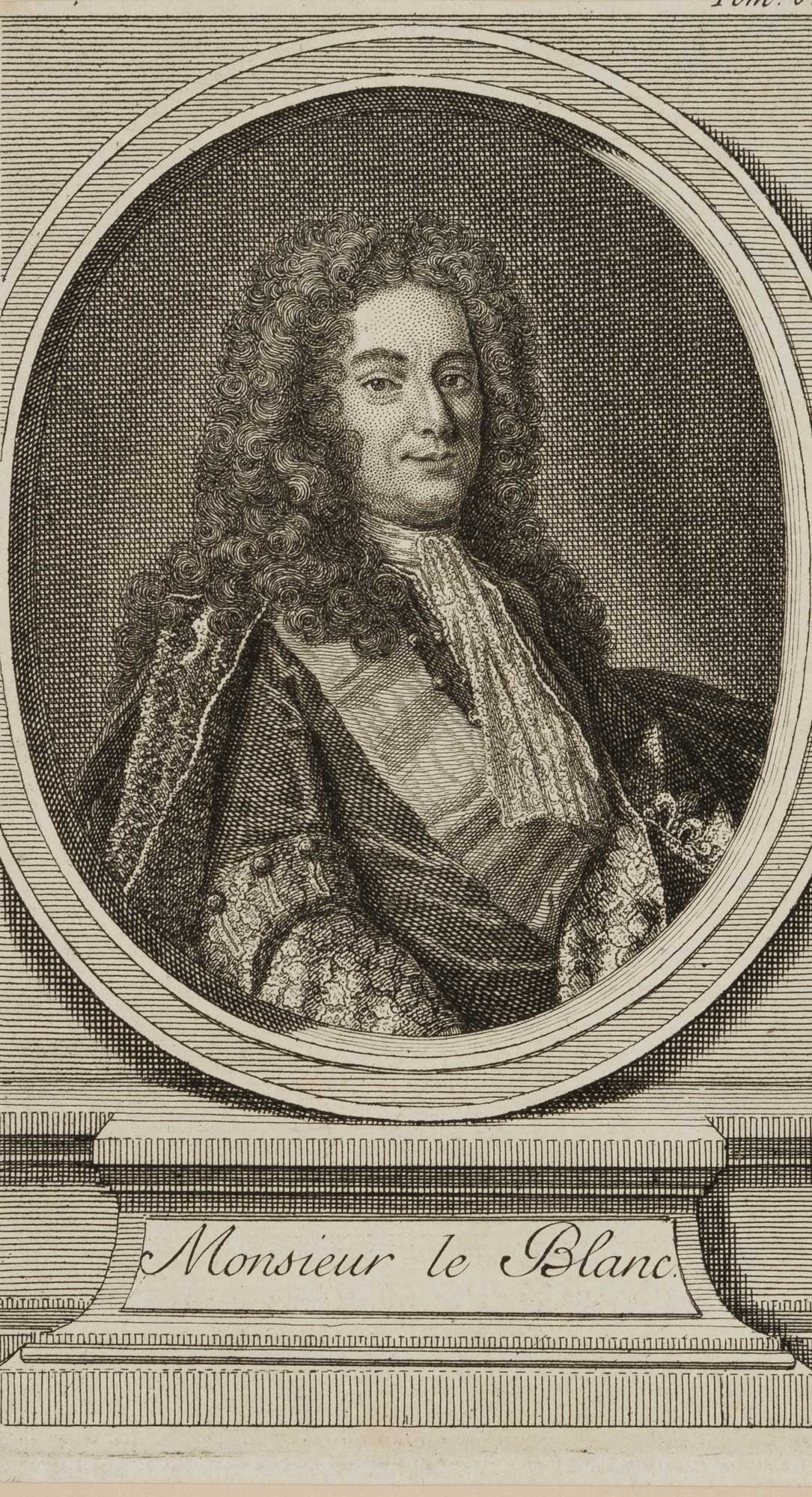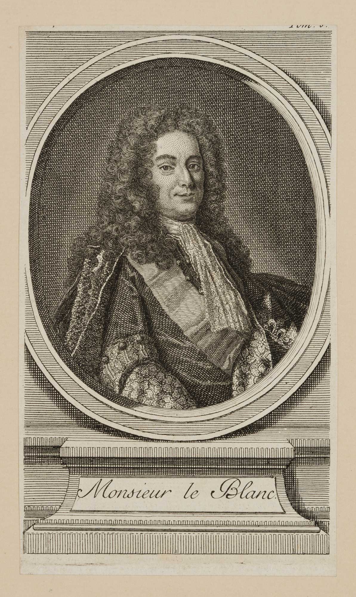 Unknown (18th century), Portrait of the French statesman Claude Le Blanc (1669 Normandy – 1728 Versailles), royal official of the Ancien Regime, in an oval as a bust in a three-quarter portrait on a plinth with neckerchief and allonge wig, 18th century, Copper engraving