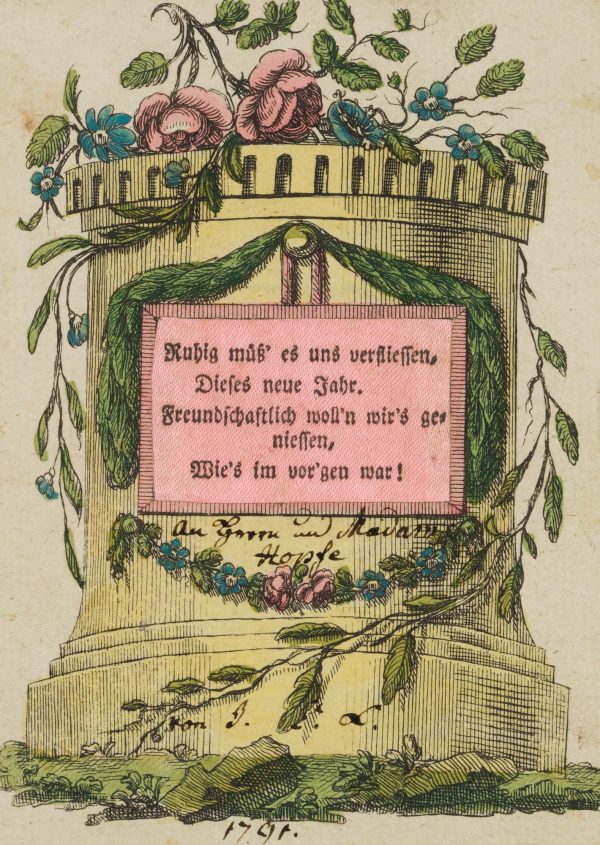 - Description: Greeting card for the New Year, with flower-covered congratulatory panel. In the centre, on a pink fabric insert, inscribed: “Calmly it must flow for us, / This new year. / Friendly we want to enjoy it, / As it was the year before! Underneath handwritten: “To Mr. and Madame Hopfe / From J. E. L. / 1791”. The card is part of a collection of greeting cards from the Biedermeier period. Please have a look at our other offers. These friendship and greeting cards represent lovable, but also cultural-historically particularly interesting testimonies of that time. At the end of the 18th century, it became a custom, especially in Vienna, to pay each other a courtesy call at the New Year and to send visiting and greeting cards.