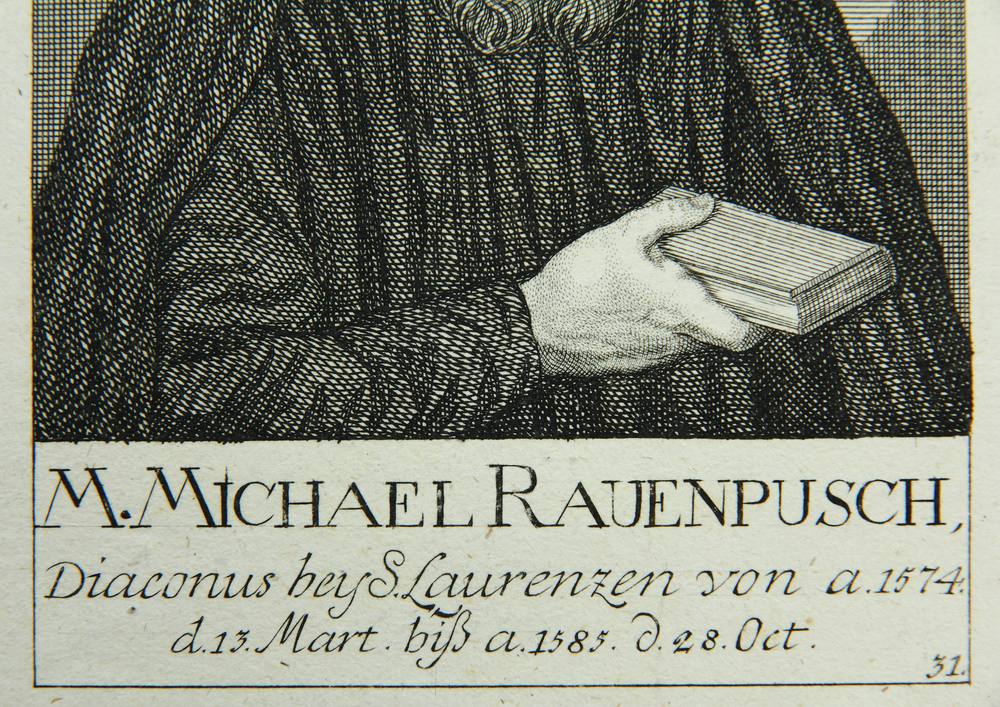 - Bezeichnung: Unterhalb der Darstellung befindet sich in der Druckplatte eine Bezeichnung mit Namen, kirchlichem Amt des Dargestellten und den Daten seiner Tätigkeit 1574 bis 1583. Unten rechts befindet sich die Nummerierung 31.