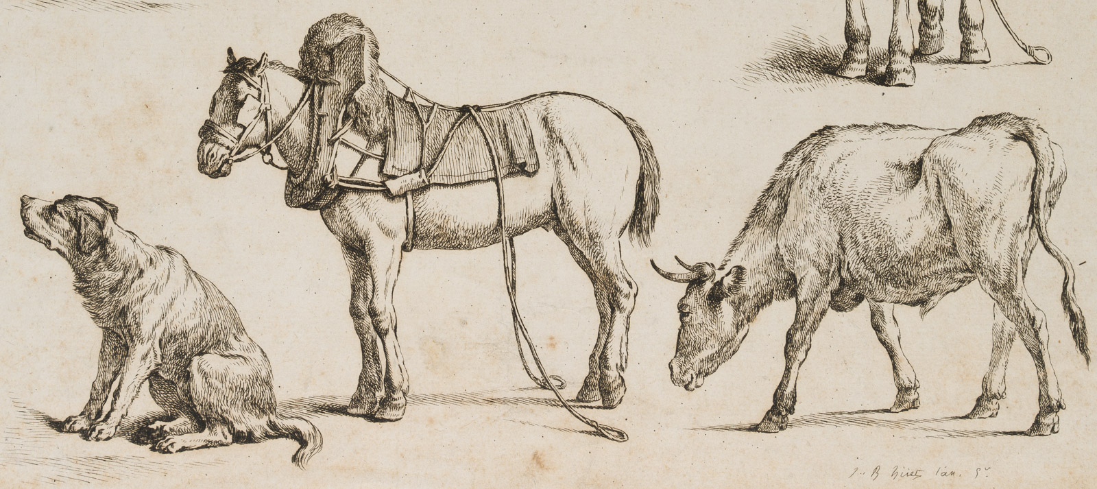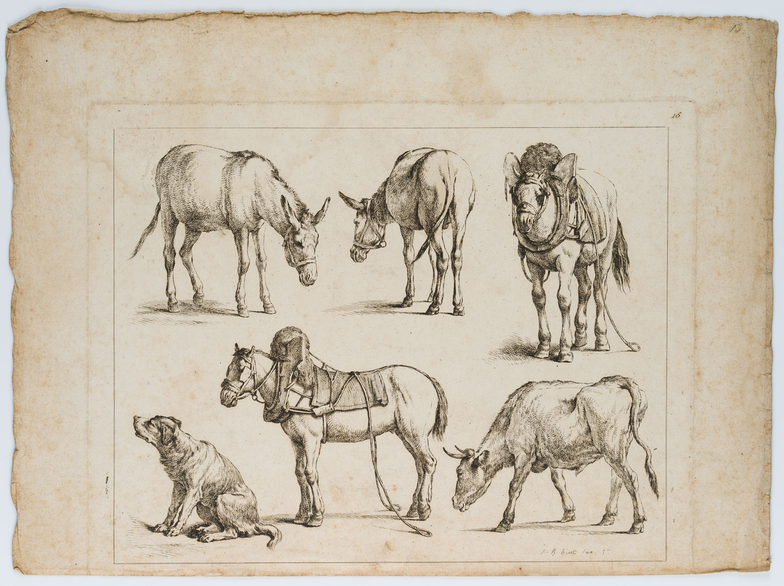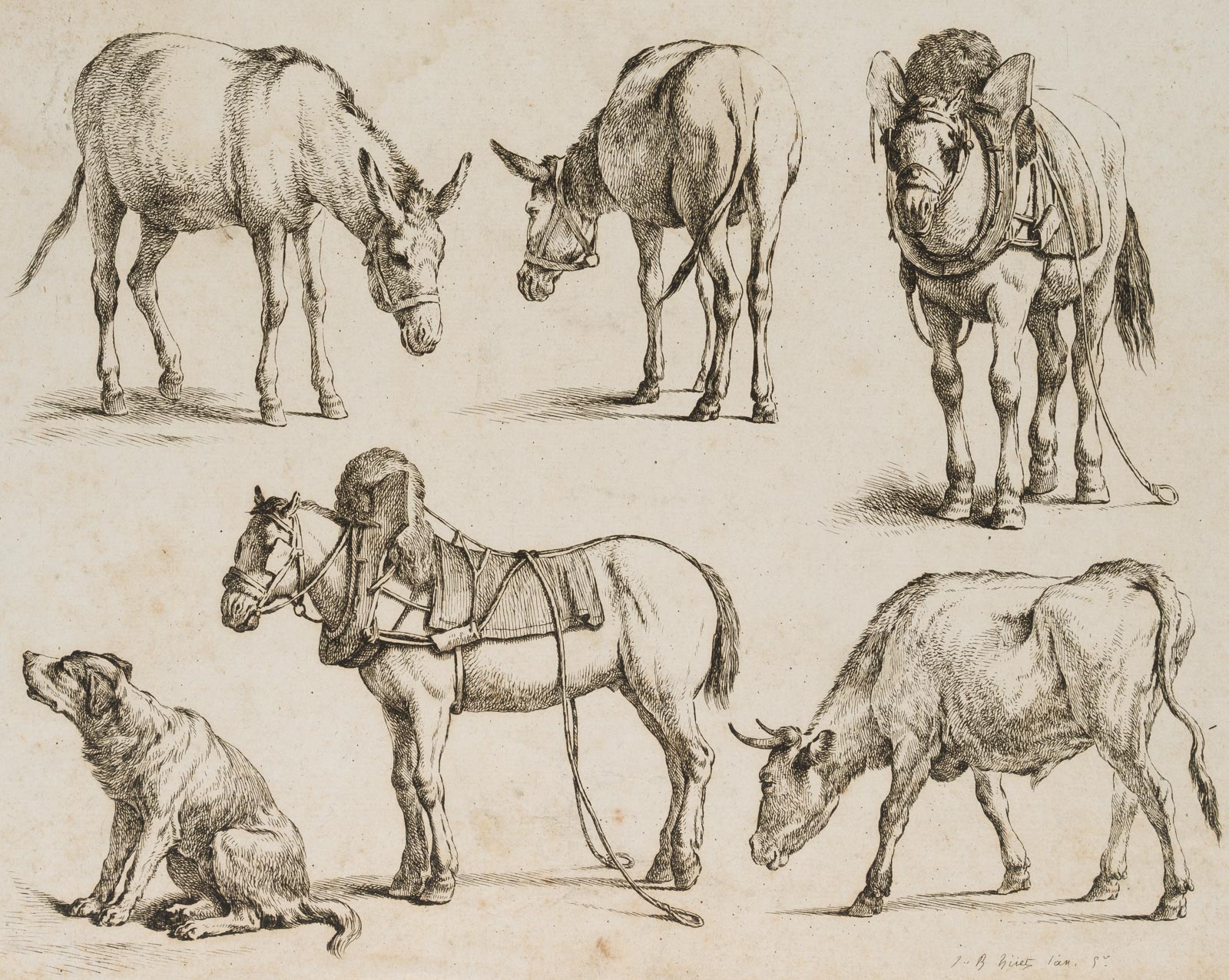 Unknown (18th century), Animal studies, donkey, dog and cow, 18th century, Etching