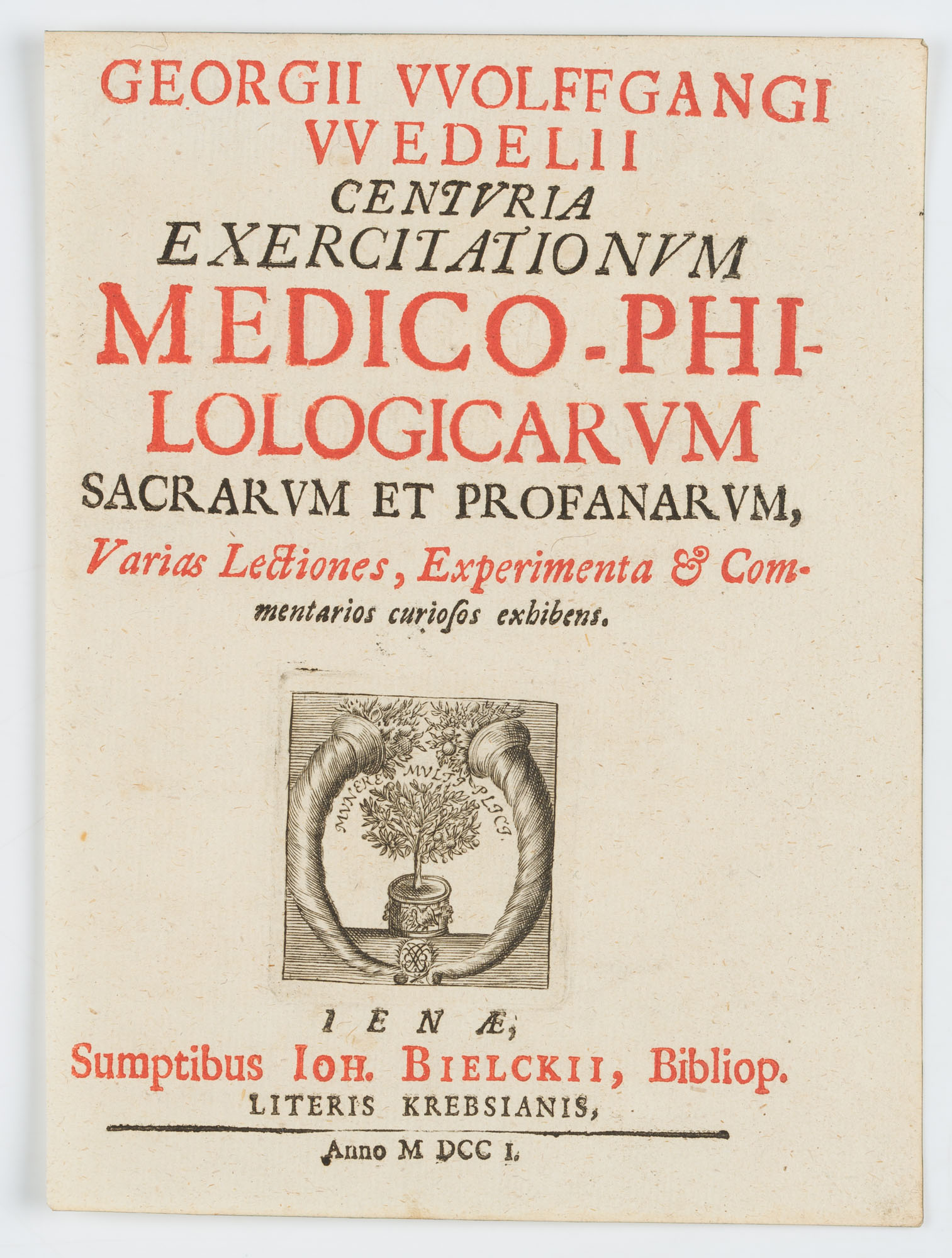 - Beschreibung: Vollständiger Titel: ‘Georgii Wolffgangi Wedelii Centuria Exercitationum Medico-Philologicarum Sacrarum Et Profanarum, Varias Lectiones, Experimenta & Commentarios curiosos exhibens’.