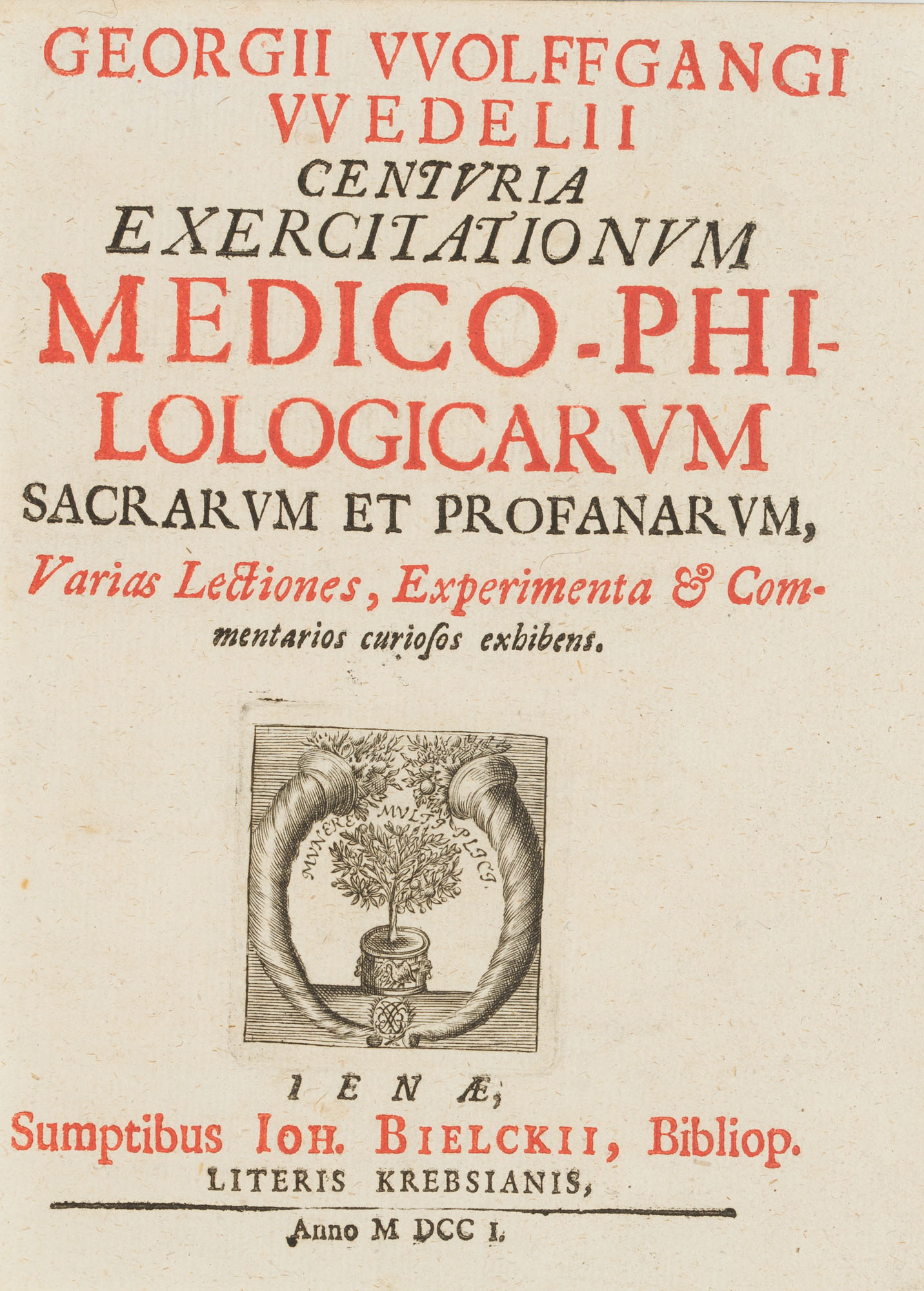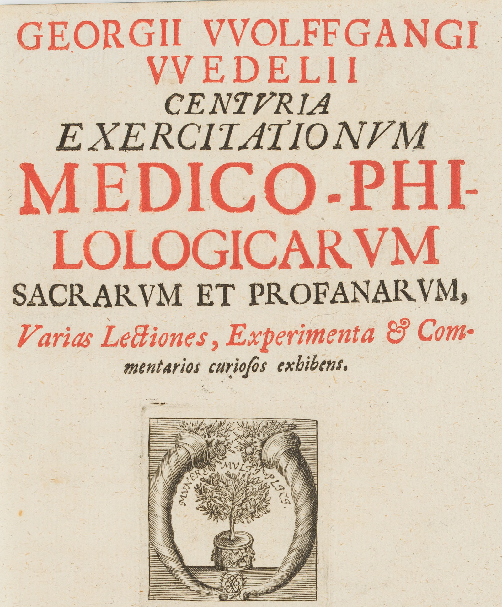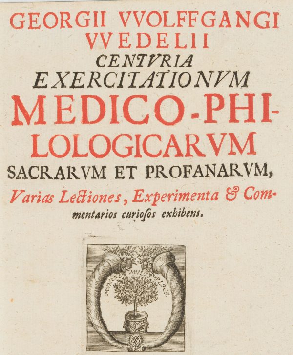- Description: Full title: ‘Georgii Wolffgangi Wedelii Centuria Exercitationum Medico-Philologicarum Sacrarum Et Profanarum, Varias Lectiones, Experimenta & Commentarios curiosos exhibens’.