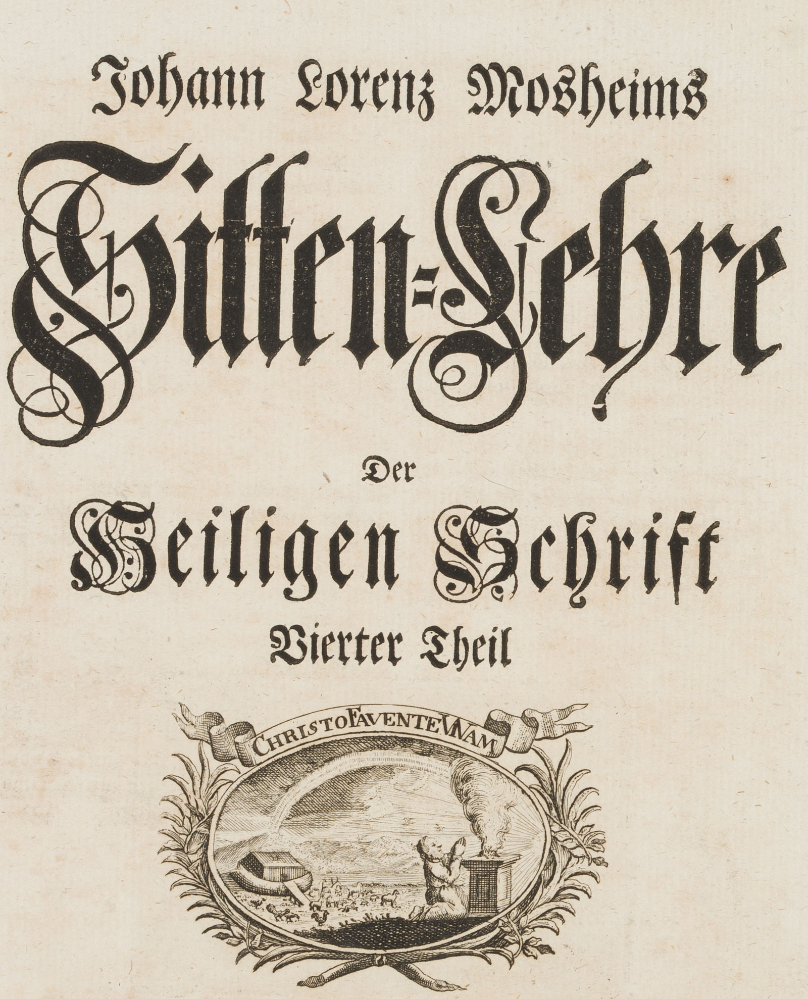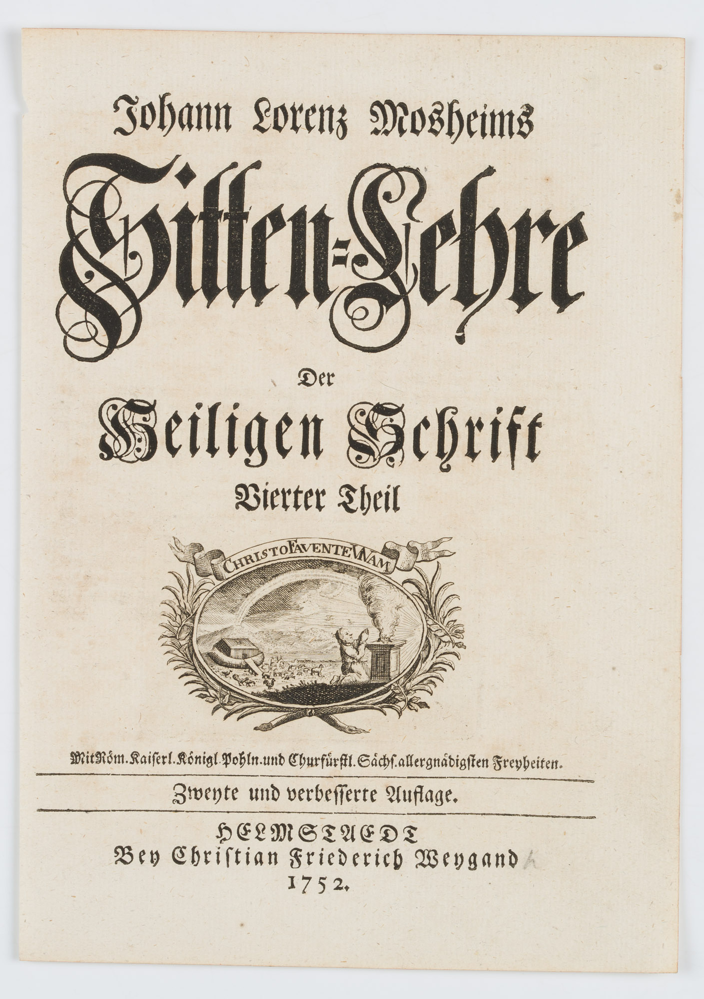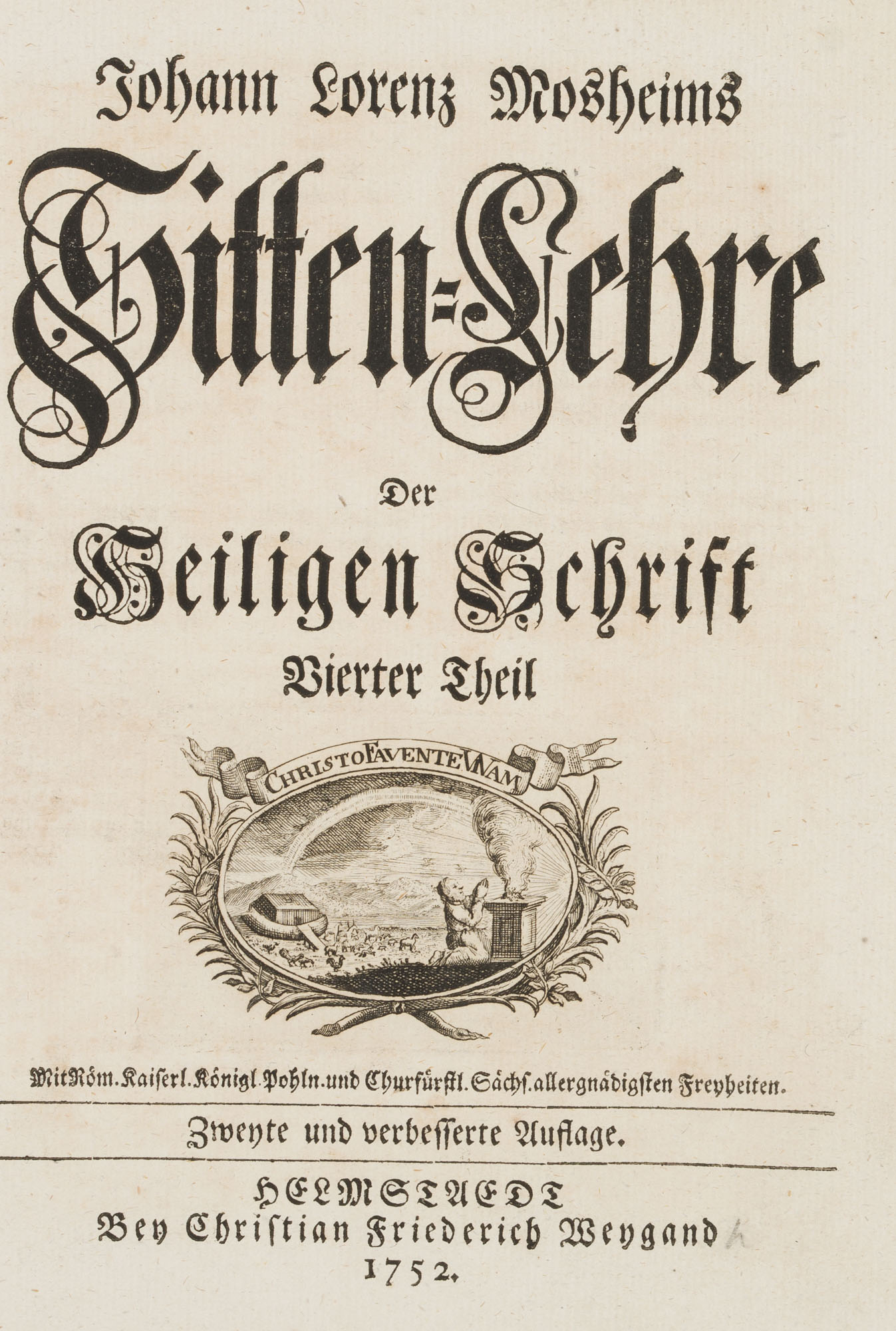 - Description: Full title: ‘Johann Lorenz Mosheims Sitten-Lehre der Heiligen Schrift Vierter Theil. With Röm. Kaiserl. Royal Pohln. And Electorate of Saxony. Allergnädigsten Freiheiten. Zwehte und verbesserte Auflage’, edited by Christian Friedrich Wengand 1752.