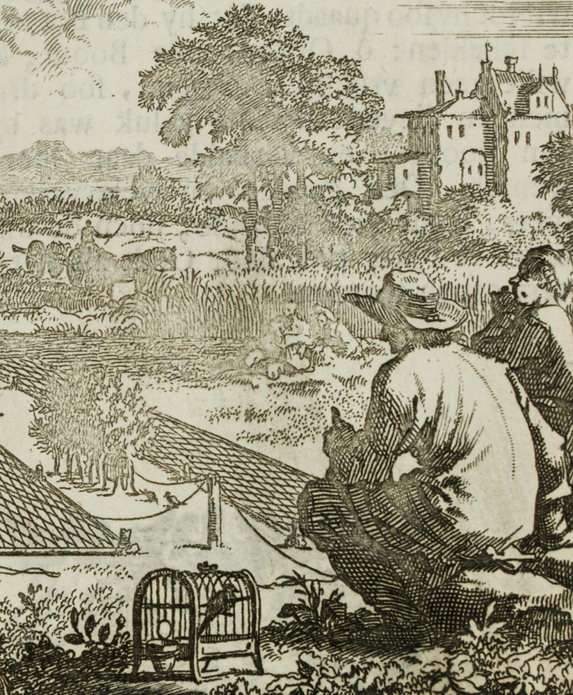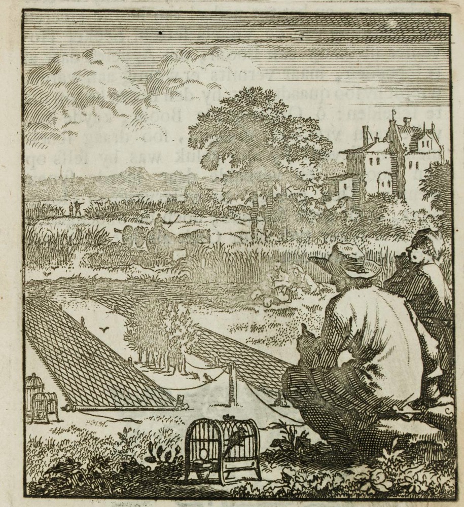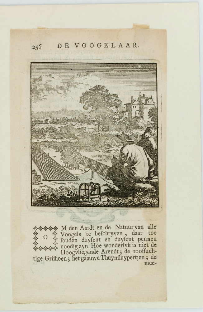 - Beschreibung: Ohne Bezeichnung; Miniatur aus einer Publikation die eine männliche Rückenfigur bei der Vogeljagd zeigt. Neben ihm ein Vogelkäfig mit Beute. Der Vogelfänger blickt in eine Landschaft mit bäuerlichen Szenerien.