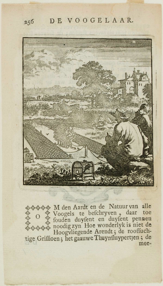 - Description: No name; miniature from a publication showing a male figure on his back hunting birds. Next to him a birdcage with prey. The bird catcher is looking into a landscape with rural sceneries.