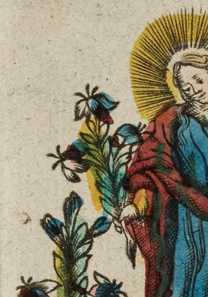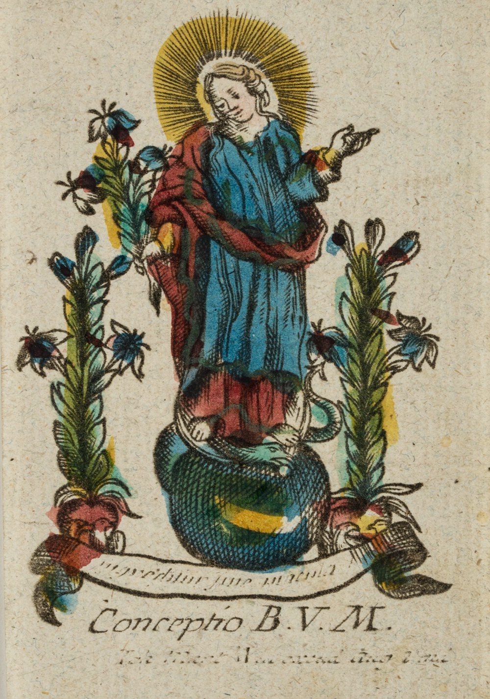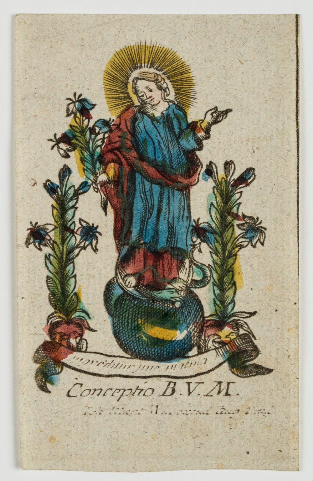 - Description: Small devotional picture or votive picture depicting the young Mother of God standing between flowering lilies on a globe. As a symbol of the Immaculate Conception. Inscribed and signed below in the printing plate, largely unrecognisable: “[…] Conceptio B. V. M. […]”. For further classification see also Adolf Spamer: Das kleine Andachtsbild.