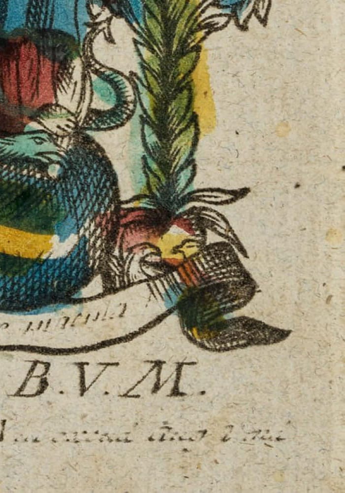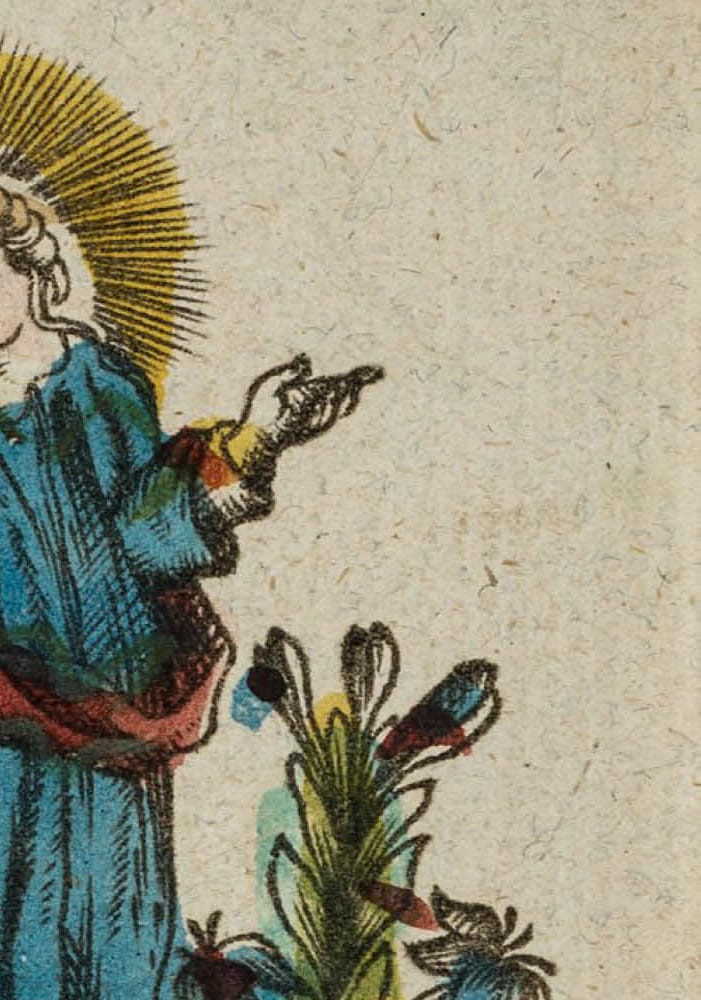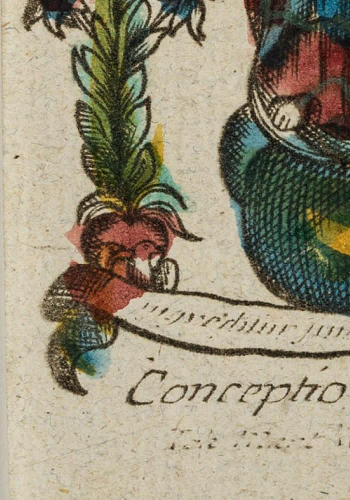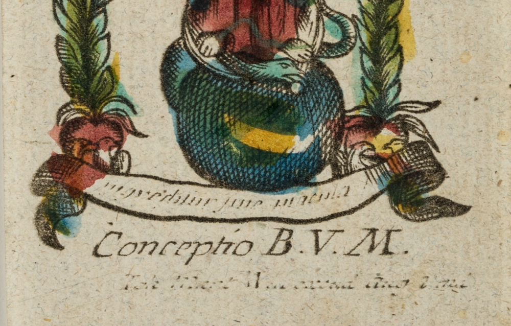 - Beschreibung: Kleines Andachtsbildchen oder Votivbild mit Darstellung der jungen Mutter Gottes zwischen blühenden Lilien auf einem Globus stehend. Als Sinnbild der unbefleckten Empfängnis. Unterhalb in der Druckplatte großteils unkenntlich bezeichnet und signiert: “[..] Conceptio B. V. M. [..]”. Zur weiteren Einordnung siehe auch bei Adolf Spamer: Das kleine Andachtsbild.